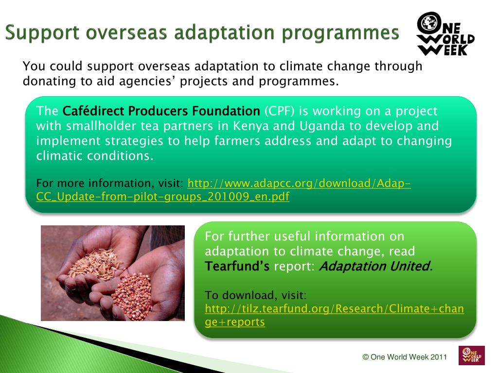 Support overseas adaptation programmes You could support overseas adaptation to climate change through donating to aid agencies’ projects and programmes. The Cafédirect Producers Foundation (CPF) is working on a project with smallholder tea partners in Kenya and Uganda to develop and implement strategies to help farmers address and adapt to changing climatic conditions. For more information, visit: http://www.adapcc.org/download/Adap-CC_Update-from-pilot-groups_201009_en.pdf For further useful information on adaptation to climate change, read Tearfund’s report: Adaptation United. To download, visit: http://tilz.tearfund.org/Research/Climate+change+reports