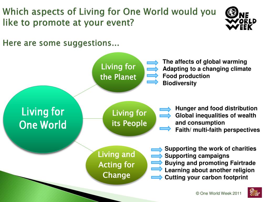 Which aspects of Living for One World would you like to promote at your event?Here are some suggestions... The affects of global warming Adapting to a changing climate Food production Biodiversity Hunger and food distribution Global inequalities of wealth and consumption Faith/ multi-faith perspectives Supporting the work of charities Supporting campaigns Buying and promoting Fairtrade Learning about another religion Cutting your carbon footprint