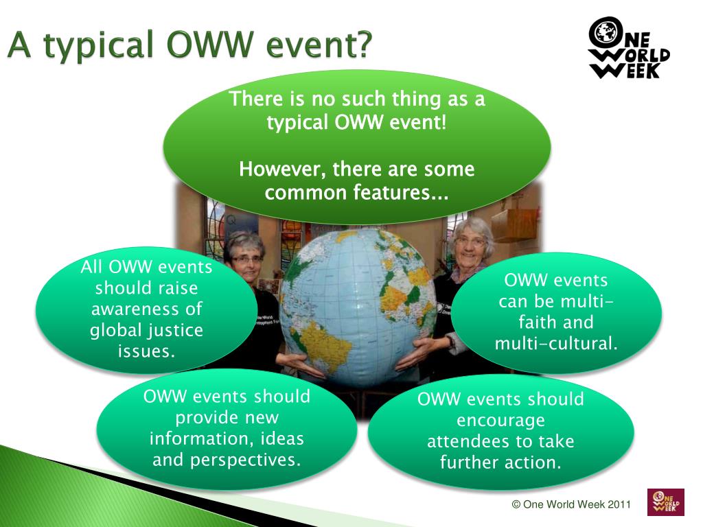 A typical OWW event? There is no such thing as a typical OWW event! However, there are some common features... All OWW events should raise awareness of global justice issues. OWW events can be multi-faith and multi-cultural. OWW events should provide new information, ideas and perspectives. OWW events should encourage attendees to take further action.