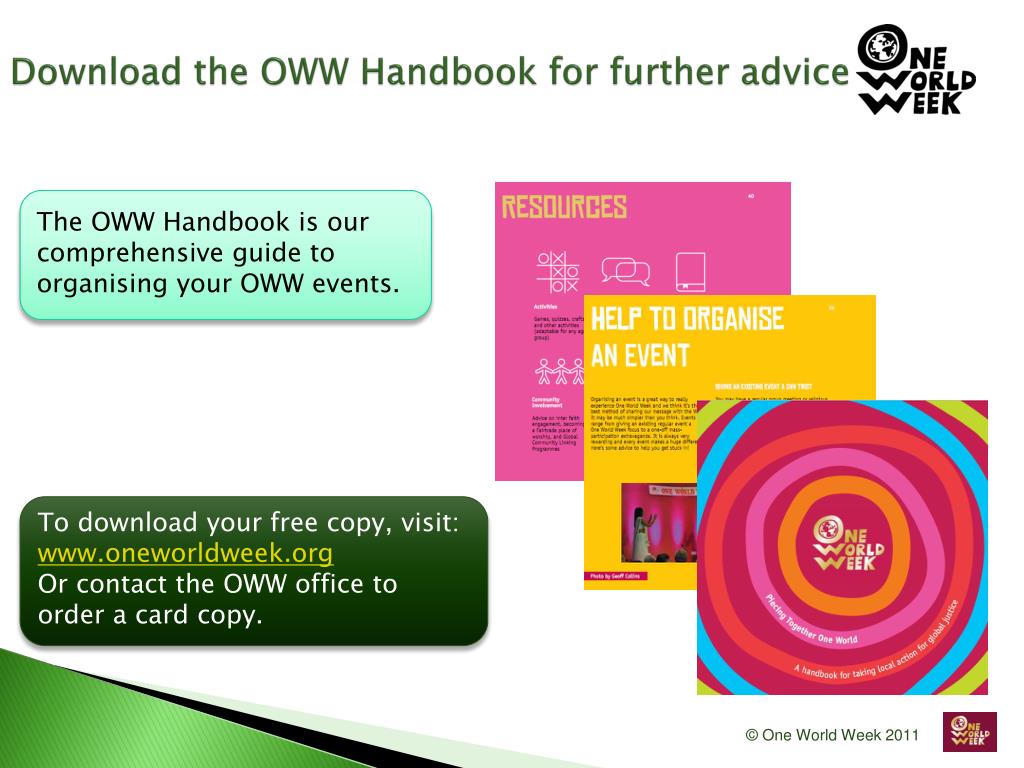 Download the OWW Handbook for further advice The OWW Handbook is our comprehensive guide to organising your OWW events. To download your free copy, visit: www.oneworldweek.org Or contact the OWW office to order a card copy.