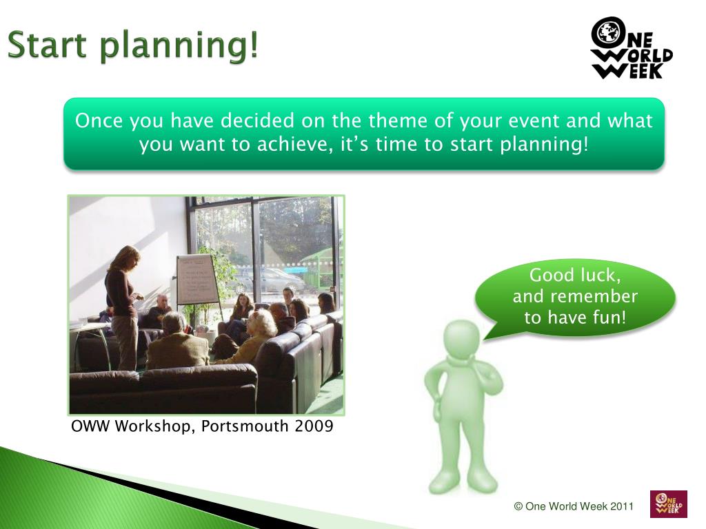 Start planning! Once you have decided on the theme of your event and what you want to achieve, it’s time to start planning! Good luck, and remember to have fun! OWW Workshop, Portsmouth 2009