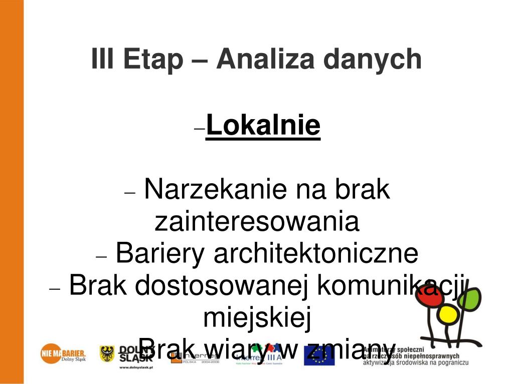 Lokalnie Narzekanie na brak zainteresowania Bariery architektoniczne Brak dostosowanej komunikacji miejskiej Brak wiary w zmiany III Etap – Analiza danych