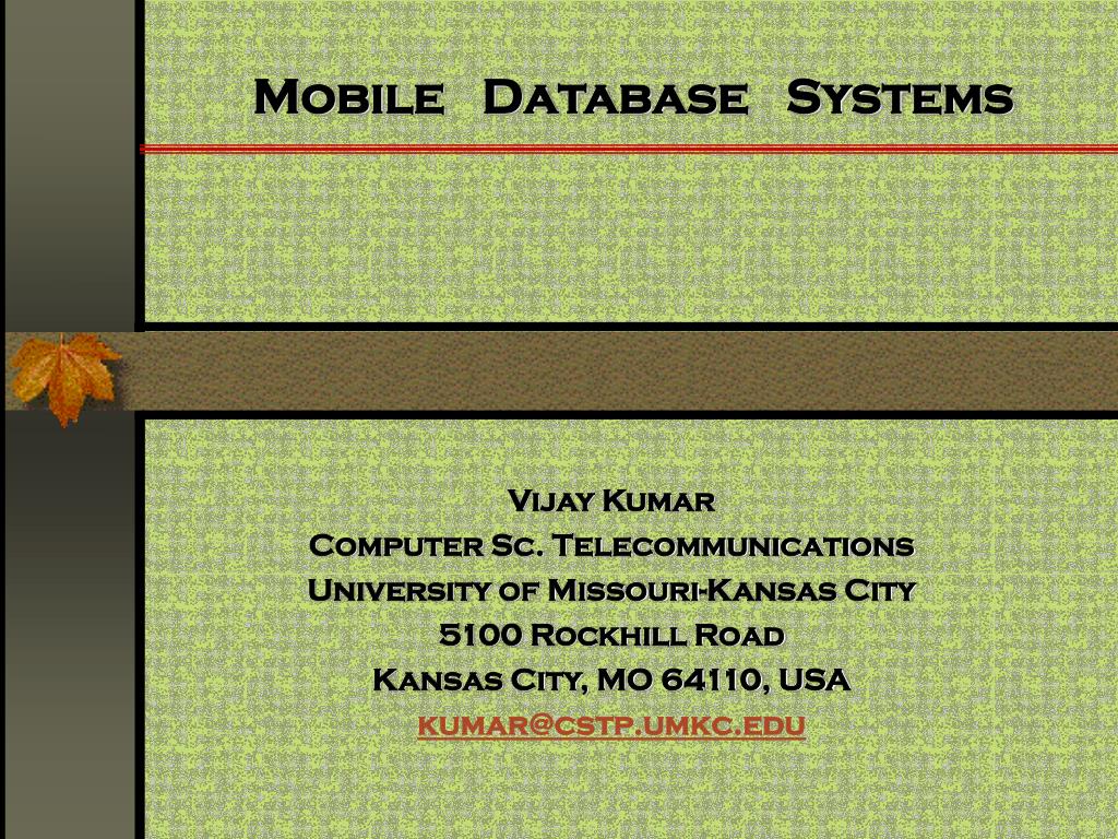 Mobile Database Systems Vijay Kumar Computer Sc. Telecommunications University of Missouri-Kansas City 5100 Rockhill Road Kansas City, MO 64110, USA kumar@cstp.umkc.edu