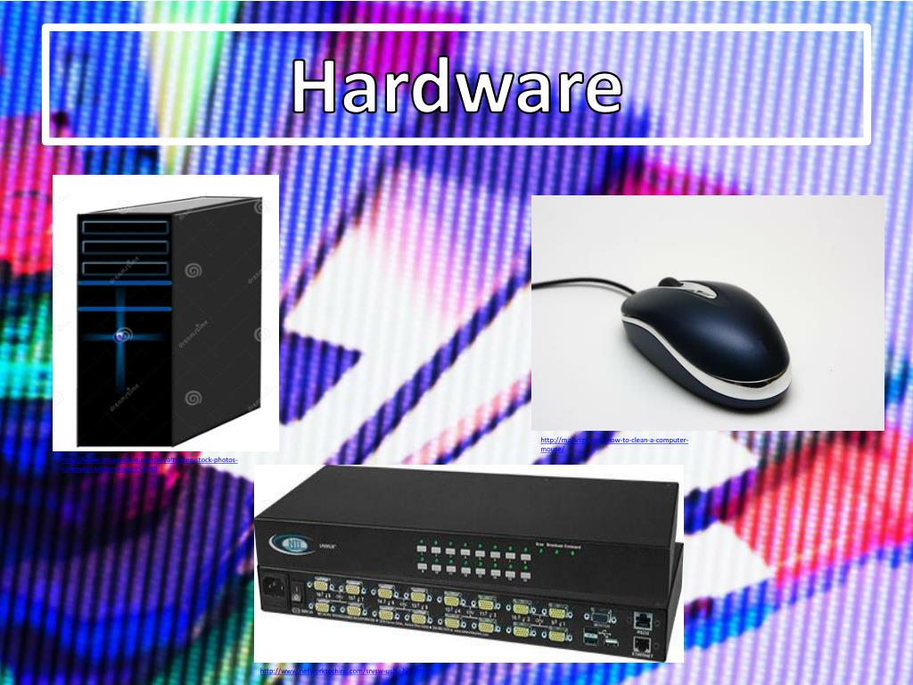 Hardware http://manvspc.com/how-to-clean-a-computer-mouse/ http://www.dreamstime.com/royalty-free-stock-photos-computer-tower-image153798 http://www.networktechinc.com/srvsw-usbu-hd.html