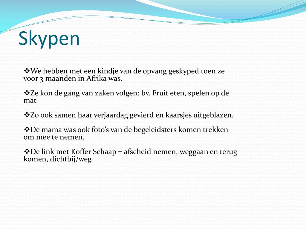 Skypen • We hebben met een kindje van de opvang geskyped toen ze voor 3 maanden in Afrika was. • Ze kon de gang van zaken volgen: bv. Fruit eten, spelen op de mat • Zo ook samen haar verjaardag gevierd en kaarsjes uitgeblazen. • De mama was ook foto’s van de begeleidsters komen trekken om mee te nemen. • De link met Koffer Schaap = afscheid nemen, weggaan en terug komen, dichtbij/weg