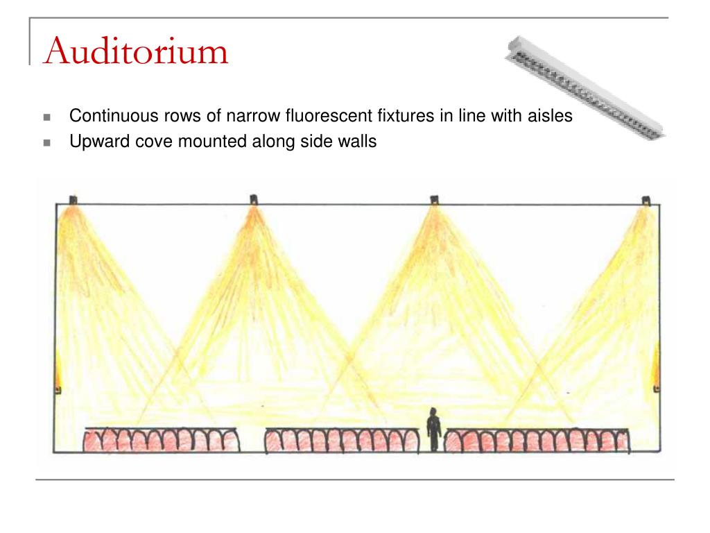 Auditorium • Continuous rows of narrow fluorescent fixtures in line with aisles • Upward cove mounted along side walls