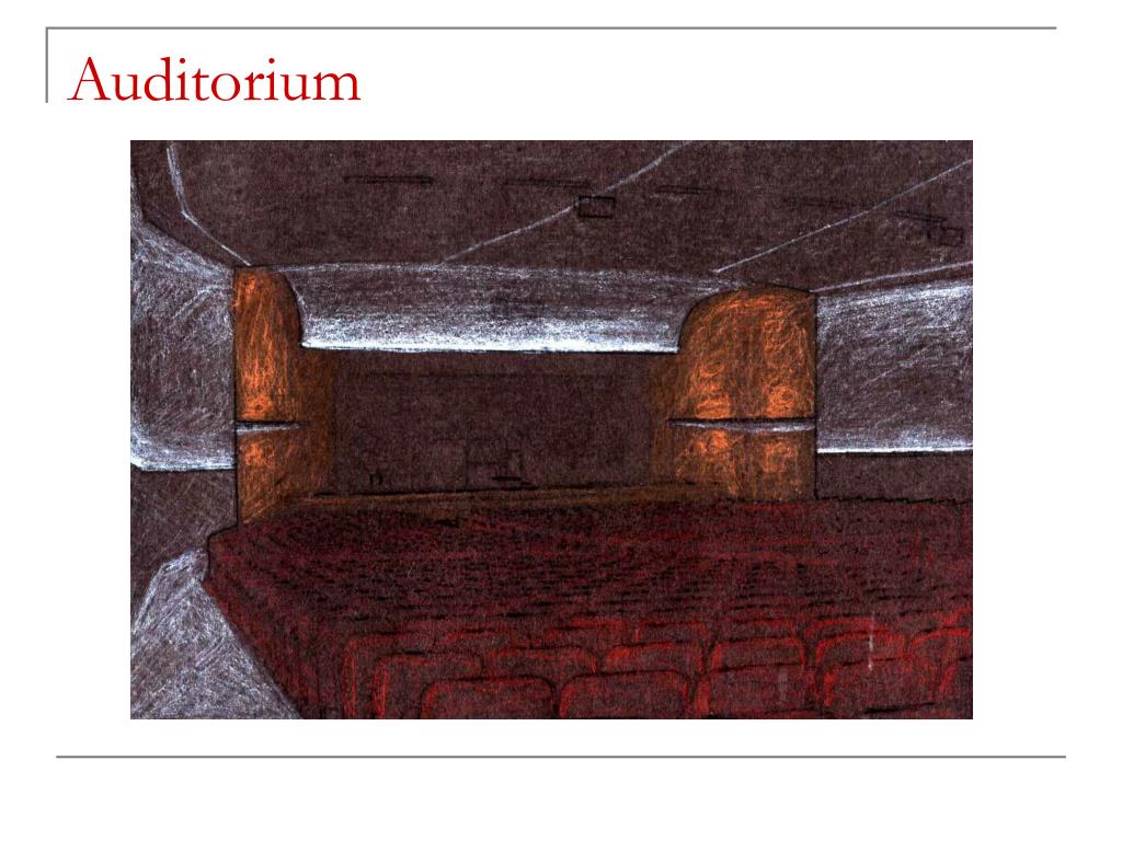 Auditorium • Architectural Elements • Dark wood proscenium • Red seating • Sloped floor and ceiling (25’ height) • Curved ceiling at stage • Low ceiling at rear