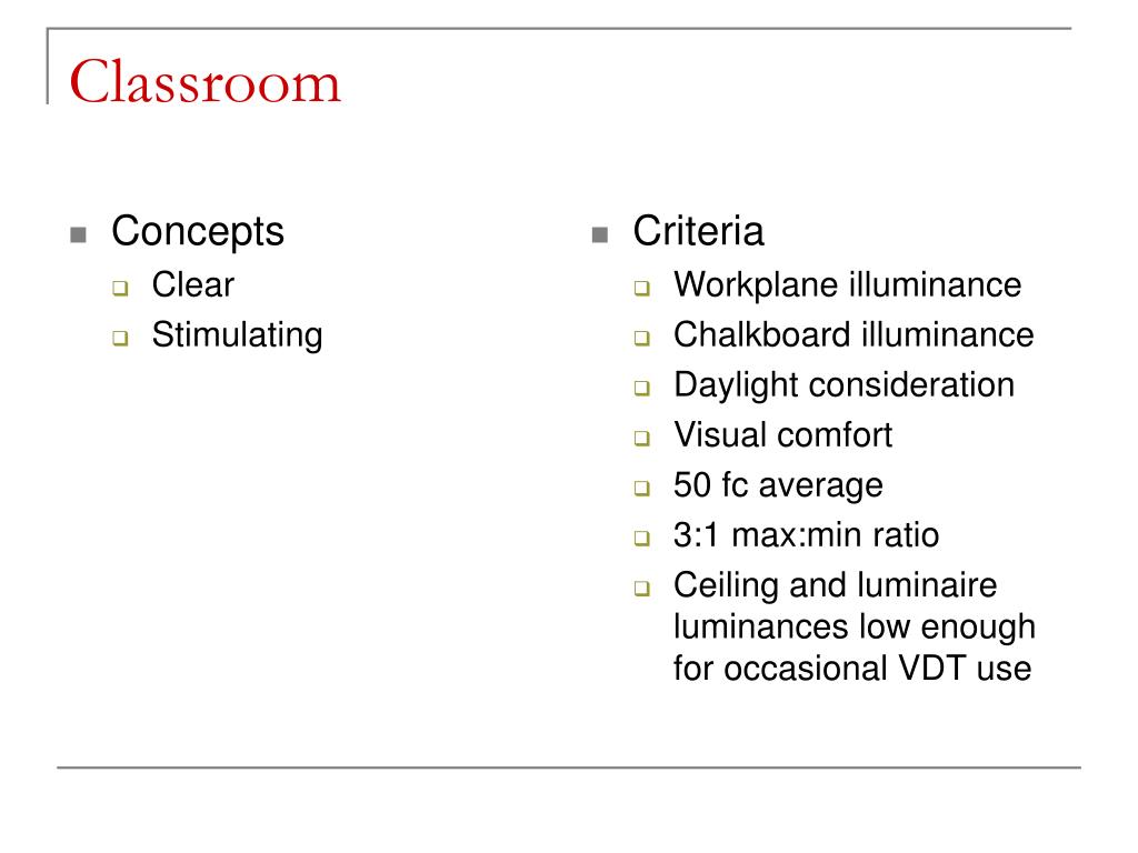 Concepts Clear Stimulating Criteria Workplane illuminance Chalkboard illuminance Daylight consideration Visual comfort 50 fc average 3:1 max:min ratio Ceiling and luminaire luminances low enough for occasional VDT use Classroom