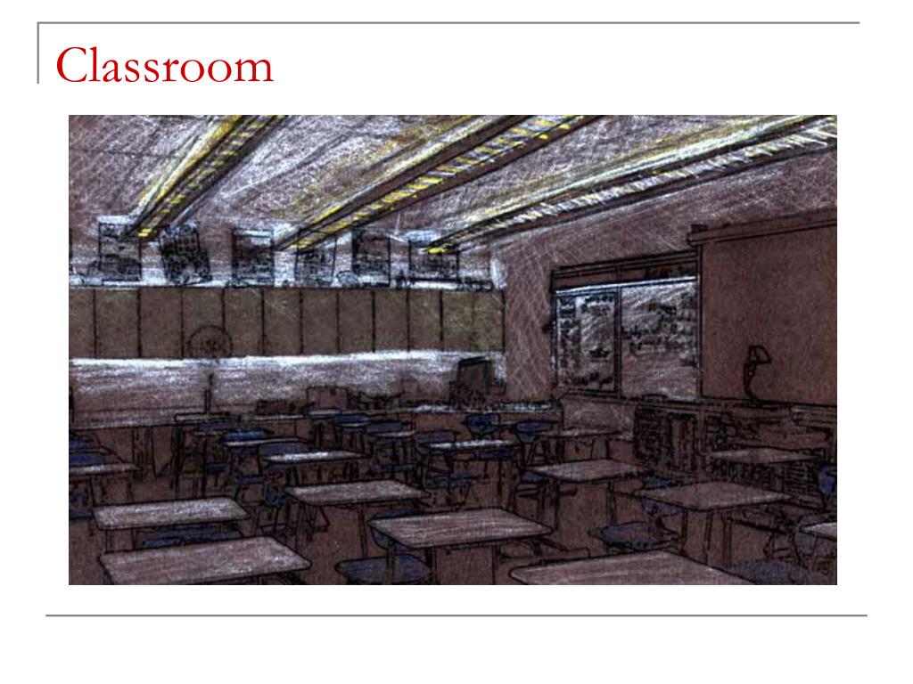 Classroom • Architectural Elements • Chalk boards • Tack boards • Projection screen • Two north facing 6’x6’ windows • Countertop with overhead cabinets and computer connections