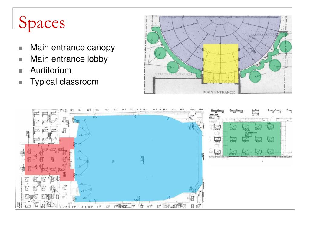 Spaces • Main entrance canopy • Main entrance lobby • Auditorium • Typical classroom