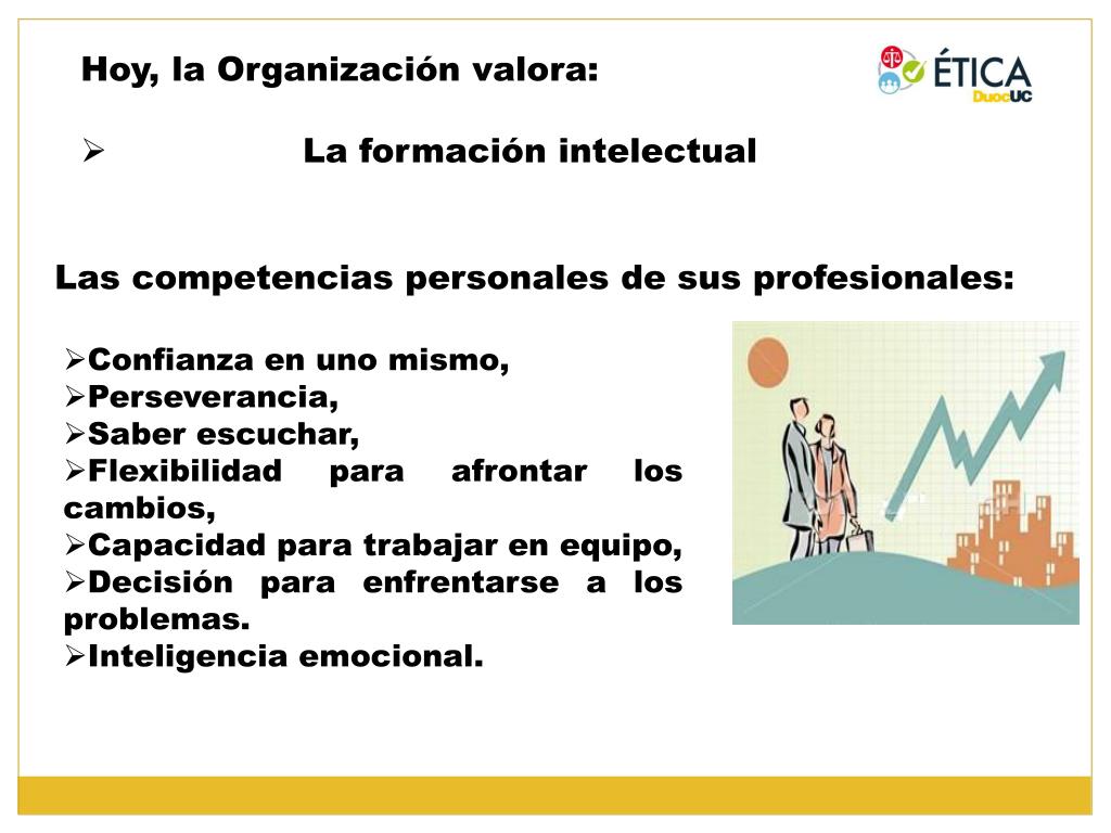 Hoy, la Organización valora: • La formación intelectual Las competencias personales de sus profesionales: • Confianza en uno mismo, • Perseverancia, • Saber escuchar, • Flexibilidad para afrontar los cambios, • Capacidad para trabajar en equipo, • Decisión para enfrentarse a los problemas. • Inteligencia emocional.