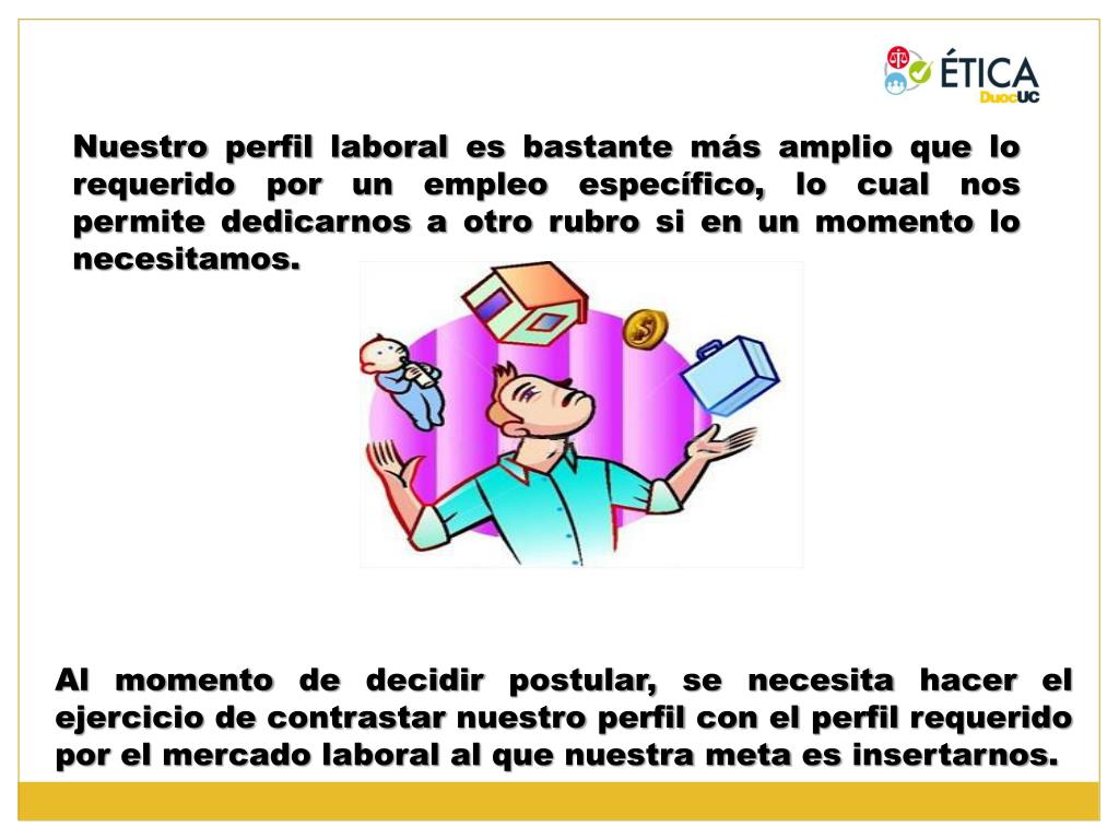 Nuestro perfil laboral es bastante más amplio que lo requerido por un empleo específico, lo cual nos permite dedicarnos a otro rubro si en un momento lo necesitamos. Al momento de decidir postular, se necesita hacer el ejercicio de contrastar nuestro perfil con el perfil requerido por el mercado laboral al que nuestra meta es insertarnos.