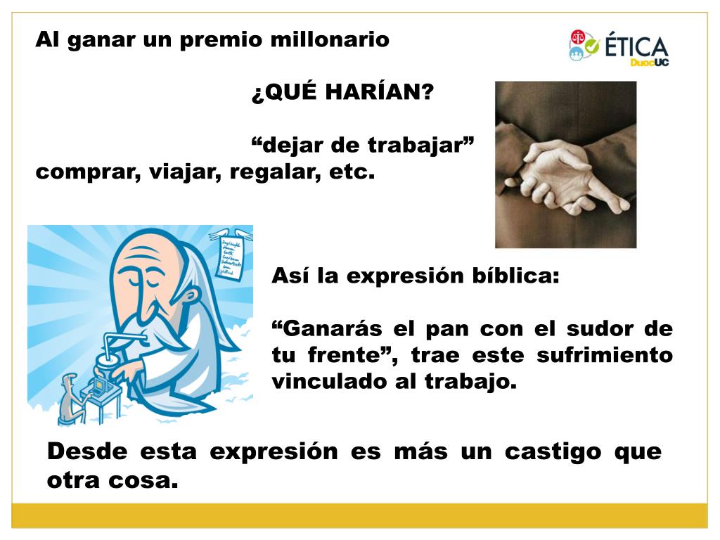 Al ganar un premio millonario ¿QUÉ HARÍAN? “dejar de trabajar” comprar, viajar, regalar, etc. • Así la expresión bíblica: • “Ganarás el pan con el sudor de tu frente”, trae este sufrimiento vinculado al trabajo. • Desde esta expresión es más un castigo que otra cosa.