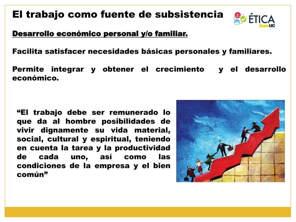 El trabajo como fuente de subsistencia Desarrollo económico personal y/o familiar. Facilita satisfacer necesidades básicas personales y familiares. Permite integrar y obtener el crecimiento y el desarrollo económico. • “El trabajo debe ser remunerado lo que da al hombre posibilidades de vivir dignamente su vida material, social, cultural y espiritual, teniendo en cuenta la tarea y la productividad de cada uno, así como las condiciones de la empresa y el bien común”