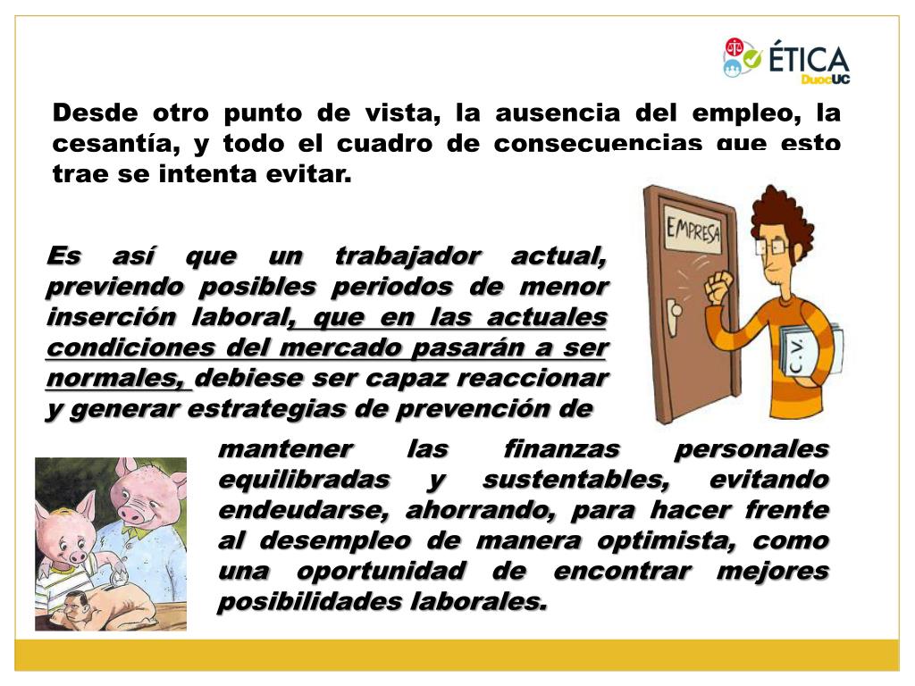 Desde otro punto de vista, la ausencia del empleo, la cesantía, y todo el cuadro de consecuencias que esto trae se intenta evitar. Es así que un trabajador actual, previendo posibles periodos de menor inserción laboral, que en las actuales condiciones del mercado pasarán a ser normales, debiese ser capaz reaccionar y generar estrategias de prevención de mantener las finanzas personales equilibradas y sustentables, evitando endeudarse, ahorrando, para hacer frente al desempleo de manera optimista, como una oportunidad de encontrar mejores posibilidades laborales.
