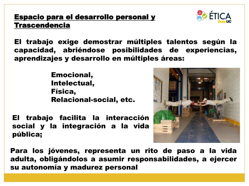 Espacio para el desarrollo personal y Trascendencia El trabajo exige demostrar múltiples talentos según la capacidad, abriéndose posibilidades de experiencias, aprendizajes y desarrollo en múltiples áreas: Emocional, Intelectual, Física, Relacional-social, etc. • El trabajo facilita la interacción social y la integración a la vida pública; Para los jóvenes, representa un rito de paso a la vida adulta, obligándolos a asumir responsabilidades, a ejercer su autonomía y madurez personal