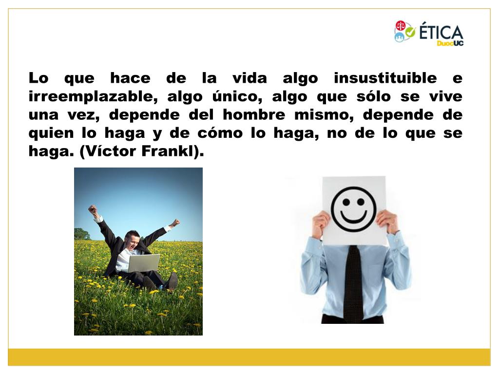 Lo que hace de la vida algo insustituible e irreemplazable, algo único, algo que sólo se vive una vez, depende del hombre mismo, depende de quien lo haga y de cómo lo haga, no de lo que se haga. (Víctor Frankl).