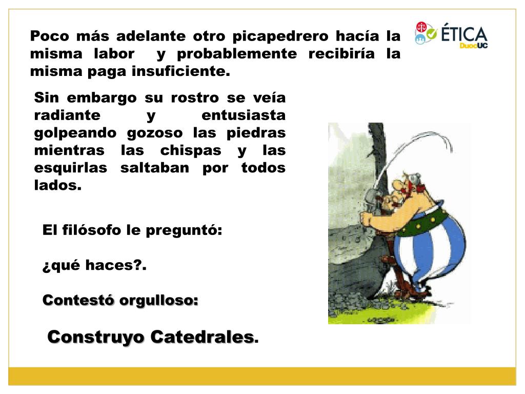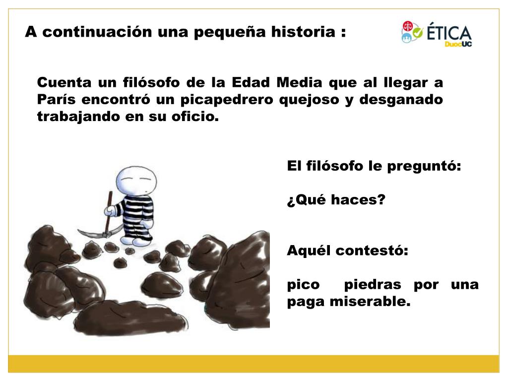 A continuación una pequeña historia : • Cuenta un filósofo de la Edad Media que al llegar a París encontró un picapedrero quejoso y desganado trabajando en su oficio. • El filósofo le preguntó: • ¿Qué haces? • Aquél contestó: • pico piedras por una paga miserable.