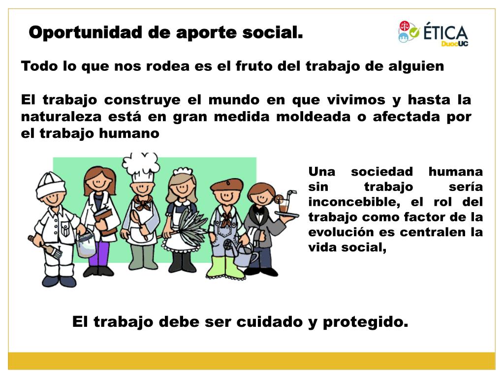 Oportunidad de aporte social. Todo lo que nos rodea es el fruto del trabajo de alguien El trabajo construye el mundo en que vivimos y hasta la naturaleza está en gran medida moldeada o afectada por el trabajo humano Una sociedad humana sin trabajo sería inconcebible, el rol del trabajo como factor de la evolución es centralen la vida social, El trabajo debe ser cuidado y protegido.