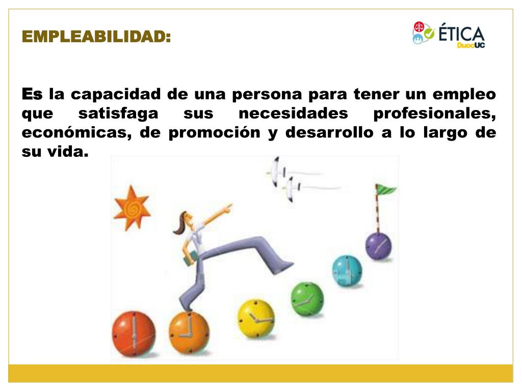 EMPLEABILIDAD: Es la capacidad de una persona para tener un empleo que satisfaga sus necesidades profesionales, económicas, de promoción y desarrollo a lo largo de su vida.