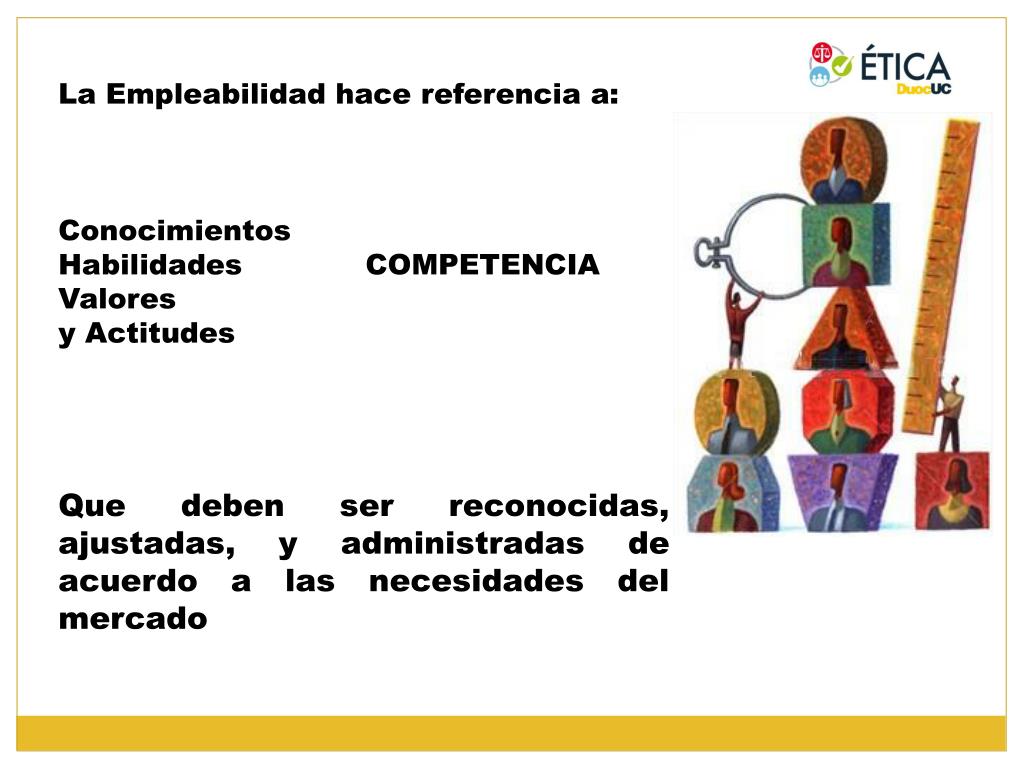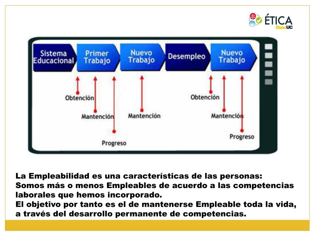 La Empleabilidad es una características de las personas: Somos más o menos Empleables de acuerdo a las competencias laborales que hemos incorporado. El objetivo por tanto es el de mantenerse Empleable toda la vida, a través del desarrollo permanente de competencias.