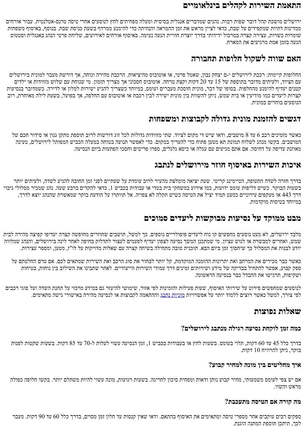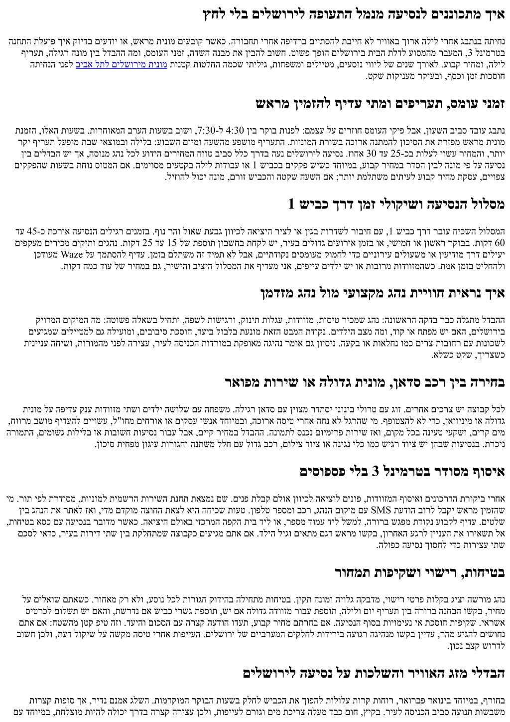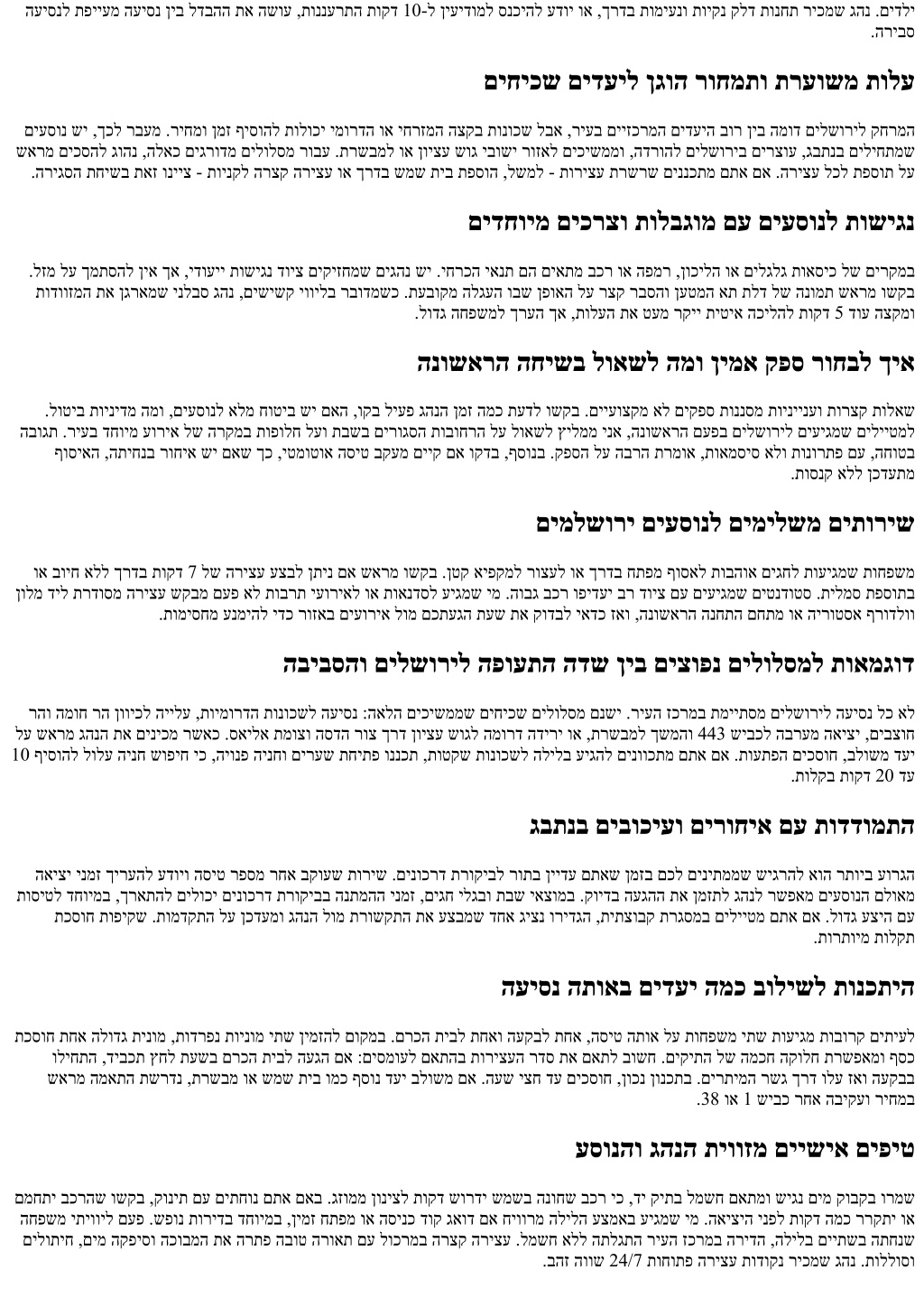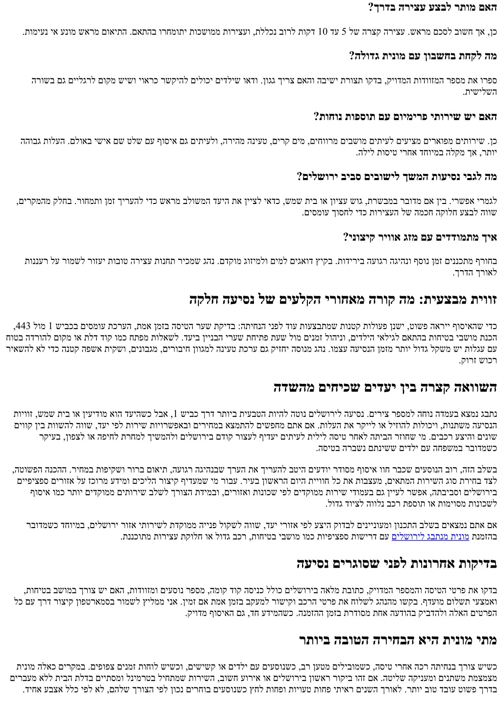 םיימואלניב םילהקל תורישה תמאתה םיחרוא רובע .תיטנלטא-סנרט הסיט ירחא םיעסונל ץחל םיתיחפמ הלעמו תיסיסב תילגנא םירבדמש םיגהנ .תובר תופש רבוד להק תכשומ םילשורי תוחפשמ ףוסיאב ,ףסונב .תבש תסינכ תעשב ףדרממ ענמיהל ידכ התיחנהו הארמהה ןמז תא שארמ ןייצל יאדכ ,תבש לע םידיפקמש תויתד תונידממ סוטטסו תילגנאב גהנה יטרפ תחילש ,םיעוריאל םיחרוא ףוסיאב .המיענ העגה תייווח תרצוי ךרדב יתודידי לוכרמב הרצק הריצע ,תורשכ תורמוש .חראמה תא םיעיגרמ תמא ןמזב העגה הרובחת תופולח לוקשל הווש םאה םילשוריב תינומל רבעמ תשרוד ךא ,החונו הריהמ תבכרה .תואיציהמ סובוטוא וא ,יטרפ לטאש ,ןובנ קחצי ם-י םילשוריל תבכר :תומייק תופולחה םידלי וא תודווזמ שולש םע תחונש ימ .ןומזת ךירצמ ךא ינוכסח סובוטוא .החרט תצקו תוקד 20 דע 15 לש תפסותב רבודמ םיתיעלו ,דויצה םע תועיסנב רבודמשכ .הרידל וא ןולמל תורישי עיגהל ךירצשכ דחוימב ,סמועו םירבעמ תכסוח תינומ ,רבד לש ופוסב .תופלחהמ ענמיהל ףידעי םינטק בור ,תרחואמ הליל תעשב ,לעופב ךא ,הפלחה םע סובוטוא וא תבכר ןיבל הרישי תינומ ןיב תוושהל ןתינ ,שמש תיב וא ןיעידומ ומכ םידעיל תורצק .תינומב םירחוב םיעסונה תוחפשמו תוצובקל הלודג תינומ תנמזהל םישגד לש םכח רודיס וא ןוגג ןקתמ תפסות בורל תושרוד גוז לכל תולודג תודווזמ יתש .דויצל םוקמ יד שיש ואדו ,םיבשומ 8 דע 6 בכר םינימזמ רשאכ הניעט ,םילשוריל לתופמה שיבכה הלעמב החוטב העונת רשפאל ידכ .םוקמב ךירעהל ידכ חותפ ןעטמ את תנומת חולשל גהנמ ושקב .םיבשומה .העיסנה םויב תועתפה וכסחו םיטירפ ורפס ,םילגלג אסיכ וא הלגע םע םיעיגמ םתא םא .הסיחד לע הפידע תנזואמ גבתנל םילשורימ רזוח ףוסיאב תורישה תוכיא רתוי םיתיעלו ,הדשל עיגהל הבוחה ןמז ינפל םייתעש לע תדמוע בורל ריעהמ תצלמומ האיצי תעש .יטירק גנימייטה ,הפועתה הדשל הרזח ךרדב יוביג ילולסמ ריכמש גהנ .העש עברב םידקהל יאדכ ,1 שיבכב תודובע וא ידטב תיב יקחשמב עוריא ומכ ,תועודי סמוע תופילד שישכ .רקובה תועשב ,ךרדל אצוי גהנהש תרשאמש רקוב תעדוה לע ורתוות לא .היופצ אל הלקת שישכ הסיטה תא ליצי דימת טעמכ םיינוריע םיפקעמ וא 443 ךרד .תומדקומ תוסיטב דחוימב םיכומס םידעיל תושקובמ תועיסנ לע דקוממ טבמ תיבל הריהמ הציפק ופידעי הרצק השפוחמ םירזוחש םיבשות ,לשמל ךכ .םיפסונ םיירלופופ םידעיל חונ וק םישפחמ םיעסונ טעמ אל ,םילשורי דבלמ הוולמש גהנהו ,םילשוריב הניל רחאל הפיחב קולדתל רוצעל םימעפל ףידעי ןופצל העיסנ ךשמה ןנכתמש ימ .ןויצע שוגל וא תרשבמל םירחאו ,שמש .תוריצע רפסמו ,ןעטמ ,ז"ול לע תוקיודמ תולאש םע הרצק החישב הליחתמ הבוט תינכות .אבה םויב ןמז ךוסחיש ךכ לולסמה תא תונבל עדוי לע םתטלחה םרט םא .םכל םיאתמש תורישה תאו בכרה גוס תא רוחבל רתוי לק ,תמדקומה הנמזהה תונורתי תאו בחרמה תא םיריכמ רבכ רשאכ תוחיטב ,תוחונ ןיב בולישה תא וניבתש רחאל .םיידועייה תורישה ידומע ךרד םינימז םיתורישו עדימ לש הקידבב ליחתהל רשפא ,עובק קפס .הנושארה העיסנב רבכ לדבהה תא ושיגרת ,תופיקשו םיבכר יגוס לעו הדשה תנחת לע יזכרמ עדימב םג רזעיהל ישומיש ,רוזא יפל תונימזהו תוליעפ תועש ,ףוסיאה יתוריש לע טוריפ םישפחמש םיעסונל .םימיאתמ השיג ירושיאב הריהמ העיסנל וא תוצובקל המאתההו גבתנ תוינומ תויורשפא לע רתוי דומלל םיצור רשאכ לשמל ,ךרוצ יפל תוצופנ תולאש ?םילשוריל גבתנמ הליגר העיסנ תחקול ןמז המכ תונפל תוטקש תועשב .תוקד 85 דע 70-ל תולעל יושע העיסנה ןמז ,1 שיבכב תודובעב וא ץחל תועשב .סמועב יולת ,תוקד 60 דע 45 ללכ ךרדב .תוקד 10 חיוורהל ןתינ ,רקוב ?עובק ריחמל הנומ ןיב םיטילחמ ךיא הלופכ הפולח ושקב .רתוי םלתשמ תויהל יושע הנומ ,תועוגר תועשב .הגירחל ןוכיס תיחפמו תואדו ןתונ עובק ריחמ ,יתועמשמ סמועל יפצ שי םא .וושהו שארמ ?תבכעתמ הסיטה םא הרוק המ רבעמ .תוקד 90 דע 60 ללכ ךרדב ,םיוסמ ןמז ןולח דע תוסנק ןיאש ואדו .םאתהב ףוסיאה תא םימיאתמו הסיט ירפסמ רחא םיבקוע םיבר םיקפס .תנגוה הנתמה תפסות ןכתית ,ךכל