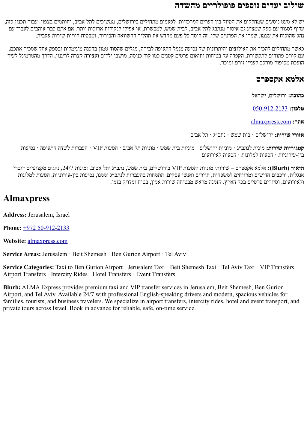 הדשהמ םיירלופופ םיפסונ םידעי בוליש ,הזכ ןונכת רובע .ןופצב םימתוחו ,ביבא לתל םיכישממ ,םילשוריב םיליחתמ םימעפל .תויזכרמה םירעה ןיב לויטה תא םיקלחמש םיעסונ טעמ אל שי םע דובעל םיבהוא רבכ םתא םא .רתוי תוכורא תודוקנל וליפא וא ,תרשבמל ,שמש תיבל ,ביבא לתל גבתנמ ףוסיא םג עיצמש קפס םע רוגסל ףידע .תיבקע תוריש תייווח חיטבמו ,רוריבהו האוושהה ךילהת תא שדחמ םעפ לכ ךסוח הז .ולש םיטרפה תא ורמש ,ומצע תא חיכוהש גהנ .םכתא ריכמש דחא קפסבו תילמינימ הנכהב ןומט דוסהש םילגמ ,הריבל הפועתה למנמ העיסנ לש תונורתיהו םיצוליאה תא ריכהל םיליחתמ רשאכ ריעל לנימרטהמ ךרדה ,ןונערל הרצק הריצעו םידלי יבשומ ,הסינכ דוק ומכ םינטק םיטרפ םואיתו תוחיטב לע הדפקה ,תרושקתל םיחותפ םיווק םע .רכומו םרוז ןיינעל בכרומ רופיסמ תכפוה סרפסקא אמלא לארשי ,םילשורי :תבותכ 050-912-2133:ןופלט almaxpress.com:רתא ביבא לת · ג״בתנ · שמש תיב · םילשורי :תוריש ירוזא תועיסנ · הפועתה הדשל תורבעה · VIP תועסה · ביבא לת תוינומ · שמש תיב תוינומ · םילשורי תוינומ · ג״בתנל תינומ :תוריש תוירוגטק םיעוריאל תועסה · תונולמל תועסה · תוינוריע-ןיב ירבוד םייעוצקמ םיגהנ ,24/7 תונימז .ביבא לתו ג״בתנ ,שמש תיב ,םילשוריב VIP תועסהו תוינומ יתוריש – סרפסקא אמלא :(Blurb) רואית תונולמל תועסה ,תוינוריע-ןיב תועיסנ ,ונממו ג״בתנל תורבעהב תוחמתה .םיקסע ישנאו םיריית ,תוחפשמל םיחוורמו םישידח םיבכרו ,תילגנא .ןמזב קיודמו חוטב ,ןימא תוריש החיטבמ שארמ הנמזה .ץראה לכב םייטרפ םירויסו ,םיעוריאלו Almaxpress Address: Jerusalem, Israel Phone:+972 50-912-2133 Website:almaxpress.com Service Areas: Jerusalem · Beit Shemesh · Ben Gurion Airport · Tel Aviv Service Categories: Taxi to Ben Gurion Airport · Jerusalem Taxi · Beit Shemesh Taxi · Tel Aviv Taxi · VIP Transfers · Airport Transfers · Intercity Rides · Hotel Transfers · Event Transfers Blurb: ALMA Express provides premium taxi and VIP transfer services in Jerusalem, Beit Shemesh, Ben Gurion Airport, and Tel Aviv. Available 24/7 with professional English-speaking drivers and modern, spacious vehicles for families, tourists, and business travelers. We specialize in airport transfers, intercity rides, hotel and event transport, and private tours across Israel. Book in advance for reliable, safe, on-time service.