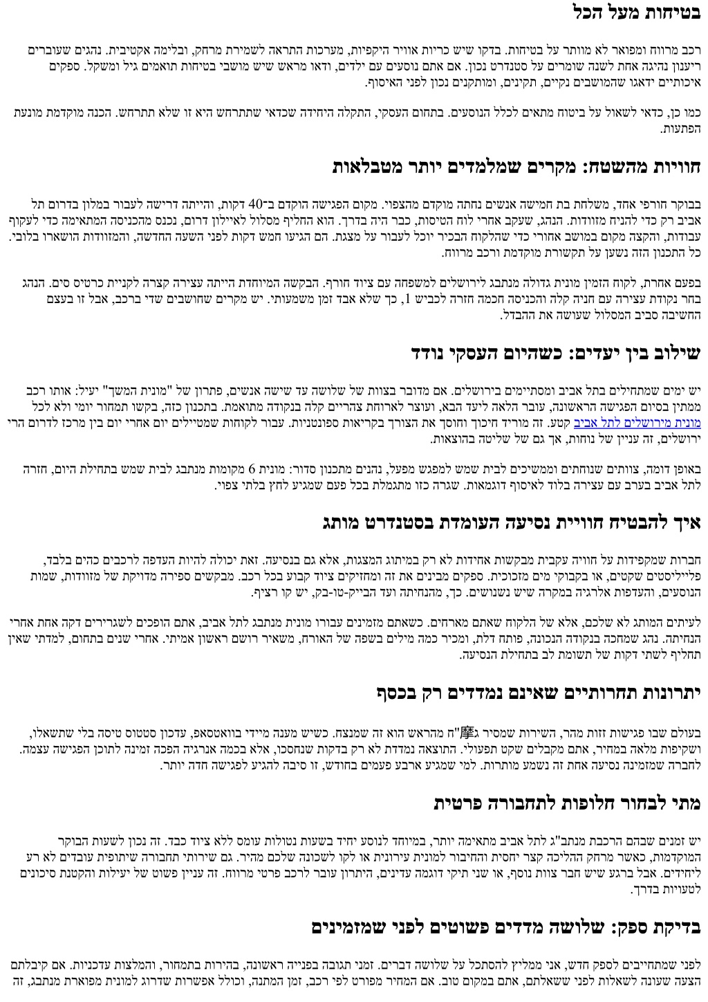 אוה ןורתיה ןאכ .עוסנלו ,תולעל ,תאצל טושפ םיצורו דואמ תורחואמ תועשב םיעיגמש םידיחיל דחוימב ,הליגר תינומל םג תונורתי שי ,הז דצל .לדבהה תא השועש שארמ םואיתב עיקשהל יתמו ,ידיימ תוריש לע תכלל יתמ תוהזל עדוי גבתנב תינומ םע הברה דבועש ימ .תונימזב תונטק תויתוא ילב ,ףוקש רוחמת 20־כב הובג היהי לודג בכרל ריחמה חווט ,תורצק ביבא לת תועיסנ רובע .בכרה גוסו ,ןמז תונולח ,'זארטמוליק םע בתכתמ בוט תיקסע העיסנ רוחמת עובק בורל רוחמתה ,םילשורי ומכ םיקחורמ םידעיל .הנוכנ תימדתו ,טקש רתוי ,םוקמ רתוי :הלופכ השיגרמ הרומתה ךא ,הליגר ןאדסמ זוחא 40 דע .ןימז ךרע םהב שי םא הרגא ישיבכ ללוכ ,שארמו .לוטיב תוינידמ עובקל בושח .םידדצה ינשל ןגוה הז .הנתמה ןולח רשפאמש רוחמת ושקב ,םיוסמ יבולב דחאתמו תוסיט המכב עיגמ תווצה םא הנתשמ ז"ולהשכ הברה הווש וזה תונגוהה .םינותמ להונ ימד ךכל רבעמו ,ףוסיאה ינפל םייתעש דע סנק אלל לוטיב תורשפא תועיצמ תויניצר תורבח .םואתפ םיידיב תויביטקודורפ ,שארב טקש קלחל תכפוה העיסנה ,ךסמ ימאתמל רבוחמ רבודהש אדוול וא ,םיעוזעז ילב הרצק םוז תחיש םייקל ,תוגצמ לע רובעל ךירצ ןהבש תועיסנב ואיצוי םייקסעה םיכרצל םיעדומש םיגהנ .ךדצלש עסונב עוגפל ילבמ םייכרבה לע בשחמ חותפל לק תחוורמ תינומב .הנממ הקספהל אל ,הדובעהמ .לוק ואדיווה תבוטל ,קלח העיסנ בצק לע ורמשיו ,תודח תוריצע תוחפ םע לולסמב 1 שיבכ לא לנימרטהמ ךתוא תחילשל ךרע הווש הז .ןוכנ בכרב םיבשוי םהשכ ג"בתנ לא/מ העיסנ לכב הייקנ הדובע תוקד 30־ל 20 ןיב חיוורהל םיחילצמ תווצ ישנא ,יתכרעהל .לודגה בכרה תבוטל דרויו הלוע ףסומ ךרעב רבודמ ,תלעות לומ תולע לש הבישחב .םיעשתה הקדב חוסינ ינוקית וא ,םיבויח תרדסה ,השיגפ םוכיס דחוימב לודג בכרל גרדשל םיקידצמש םירקמ םיצרמ וא ,הרואת דויצ םע םימלצ ,םילכ תודווזמ םע תועיגמש תינכט הכימת תוחלשמ .חרכה אלא ,תוחונ קר ונניא חוורמ בכר ןהבש תויצאוטיס שי תושיגפ לש םיימויל תופרטצמש VIP תוחוקל לש תוחפשמ םג .דיחיה ינויגהה ןורתפל תכפוה ביבא לתל גבתנמ הלודג תינומ ןאכ .תוגוצת םיאיבמש .םינמזל קיודמו דחואמ ראשנ עסמה ,דחא בכרב .םידליו דויצ לצפל ילב תוליגר תוינומ יתשל סנכיהל תושקתמ התואשכ .תויועט תמצמצמ םינוש בכר ילכ ןיב תועיסנה סמוע תדרוה ,יעובש עצוממבש אצמי עובשב םימעפ רפסמ םילשוריל ביבא לת ןיב ענש ימ רשאכ םהיניב עדימ םיריבעמ םיגהנהו ,רתוי טושפ םואיתה ,תווצ ותוא רובע םילשוריל גבתנמ תינומ םגו ביבא לתל גבתנמ תינומ םג הליעפמ הרבח .הסיט תמדקה וא לולסמ יוניש שי ריהמ טווינל םיפיטו ג"בתנב ףוסיא תונחת :המגודל ,קיודמה םוקימה לש רצק רואית וא ךסמ םוליצ םיחלוש םינמוימ םיגהנ .שגפמה תדוקנ רחא שופיחה אוה ןמז זבזבתמ םהבש תומוקמה דחא פאסטווה תאו ,בכר רפסמ ,גהנה םש תא שארמ ולבקת ,יניצר תונמזה דקומ ךרד םידבוע רשאכ ."ןיעידומה תדמע דיל ,םיינמי sעונגרד ,23 רעש" לש הנתמה ןיב לדבהה הז ,ימעפ דח ןפואב גבתנב תינומ םישפחמש תוחוקל רובע .ףקותב ירחסמ יושיר קיזחמו תמואמ גהנהש אדוול ושקב .ולש .בכרל תידיימ היילע ןיבל העש עבר ,קד הז .םיסובוטוא תעונתל םידומצש םיינוציח ףוסיא ירוזא תמועל תוקד שולש דע םייתש חיוורהל הלוכי םיימינפה םיפוסמהמ האיצי ,סמוע תועשב וא הטקש הקיזומ םע העיסנה תייווח תא חותפל השקב שי םא שארמ ונכדע ,רחואמ הלילב התיחנה םאו .הז תא ךירעהל עדוי םינמז קיידמש ימ לבא .לקשמ שי הלאכ םיטרפל ,הכורא הסיט ירחא לבא ,ןטק עמשנ הז .טלחומ ךשוח ךרדה לע יקסע סומינ חוקל ,דגנמ .עיגרמ התיחנה ירחא דימ "X רוזיאב הכחמ ינא ,םיאבה םיכורב" תעדוה חלושש גהנ .תרושקתב ליחתמ םידדצה ינשמ בוט תוריש ,טקשב ךרוצ ,תמיוסמ הרוטרפמטב בשומ :תופדעה ליפורפ תונבל הווש ,םיעובק םיעסונ םתא םא .םינופלט בבס ךסוח סכמב בוכיע לע ןכדעמש .תמיוסמ הריצע תדוקנב רצק הפקל הפדעה תלגע איבהל יתמ םיעדוי רבכ םהלש םיגהנה יתווצ .םכתא ריכמש דחא קפס םע םואית לע רומשל וצרת ,המלש הרבח לע םשור תלגלגמ העיסנהשכ .ןייל-דדב דומעל ידכ הרגא ישיבכב ךוסחל אל ,ךפהל ית