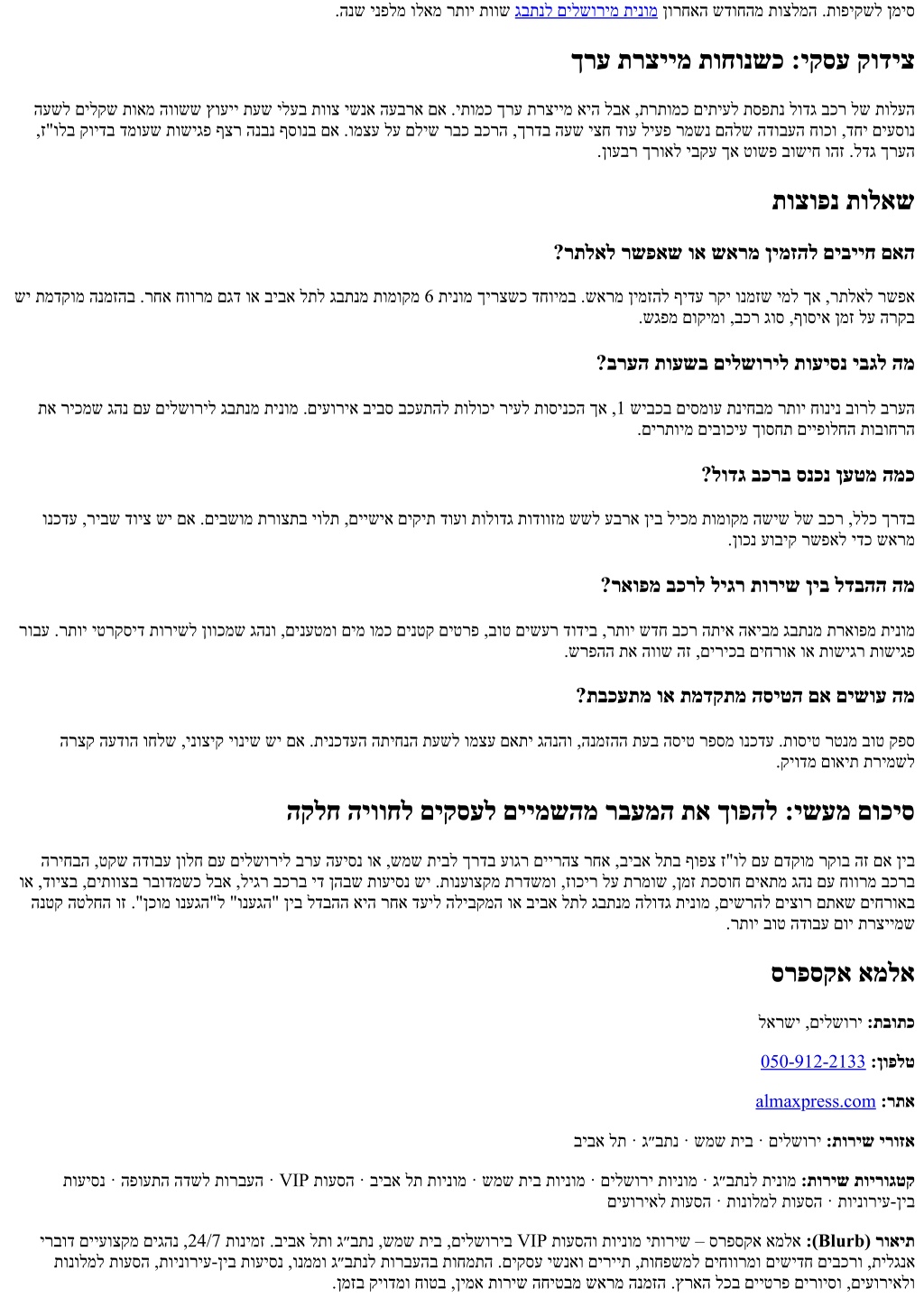 Almaxpress Address: Jerusalem, Israel Phone:+972 50-912-2133 Website:almaxpress.com Service Areas: Jerusalem · Beit Shemesh · Ben Gurion Airport · Tel Aviv Service Categories: Taxi to Ben Gurion Airport · Jerusalem Taxi · Beit Shemesh Taxi · Tel Aviv Taxi · VIP Transfers · Airport Transfers · Intercity Rides · Hotel Transfers · Event Transfers Blurb: ALMA Express provides premium taxi and VIP transfer services in Jerusalem, Beit Shemesh, Ben Gurion Airport, and Tel Aviv. Available 24/7 with professional English-speaking drivers and modern, spacious vehicles for families, tourists, and business travelers. We specialize in airport transfers, intercity rides, hotel and event transport, and private tours across Israel. Book in advance for reliable, safe, on-time service.