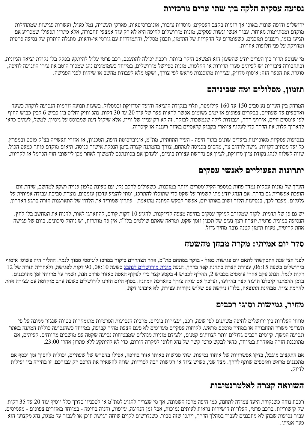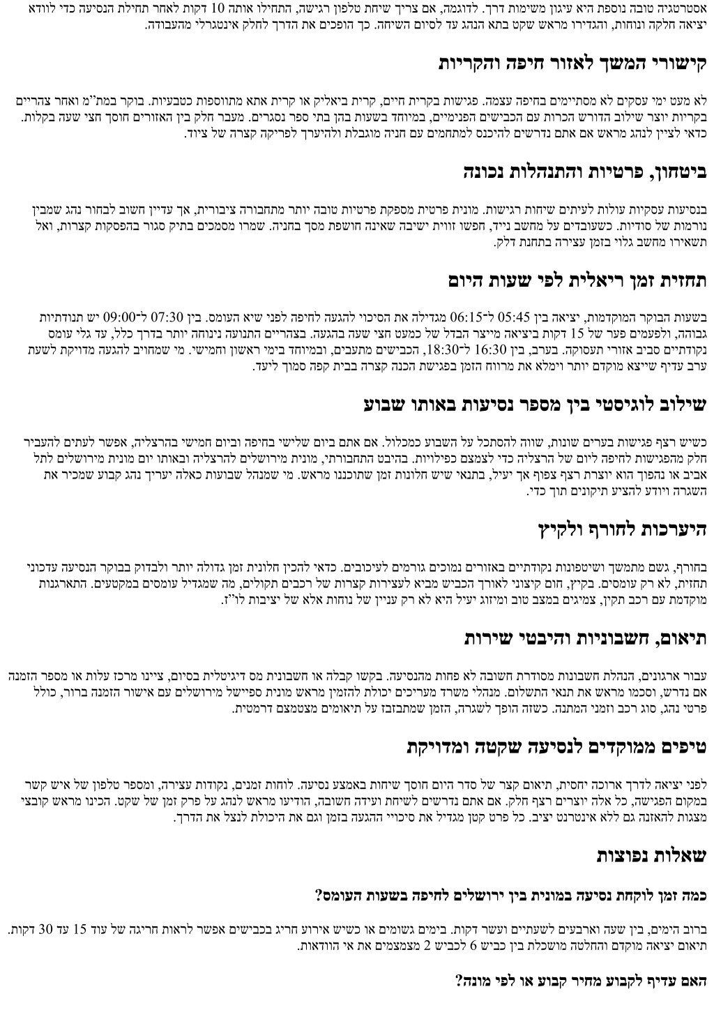 תויזכרמ םירע יתש ןיב הקלח תיקסע העיסנ תוליחתמש תושיגפ תורשעו ,ליעפ למנ ,היישעת יקראפ ,תואטיסרבינוא ,רוביצ תודסומ :םיקסעה בצקב תומוד ךא יפואב תונוש הפיחו םילשורי םא עירכמש ילועפת ןורתפ אלא ,הרובחת יעצמא דוע קר אל איה הפיחל םילשורימ תינומ ,םיקסע תושנו ישנא רובע .רחואמ תומייתסמו םדקומ תיטרפ העיסנ לש ןורתיה הלגתמ ,תואדו-יא ימרוג םע תודדומתהו ,לולסמ ןונכת ,ןומזתה לש תויוקדה לע םידמועשכ .םינכומו םיננער ,ןמזב ועיגת .תורחא תופולח ינפ לע תקיודמו ,תינויגה האיצי תדוקנ ילב קקפב עקתיהל לולע יטרפ בכר ,בכעתהל הלוכי תבכר .רתויב רקיה באשמה אוה ןועשהש עדוי םירעה ןיב רידת עסונש ימ ,הפיחל העונתה יריצ תא בטיה ריכמש גהנ םינימזמשכ דחוימב ,םילשורימ לשייפס תינומ .תופלחה וא תורידת ירעפ םיתיעל שי תירוביצ הרובחתבו .השיגפה ינפל תוחיש וא בשחמ תדובעל אלמ טקשו ,ךרוצ יפל שארמ תוננכותמ תוריצע ,קיודמ ףוסיא :הזה רעפה תא תרגוס םהיניבש המו םילולסמ ,ןומזת העשכ תחקול העיסנה תומרוז העונת תועשב .לולסמבו תקיודמה דעיהו האיציה תדוקנב יולת ,רטמוליק 160 דע 150 ביבס ענ םירעה ןיב קחרמה ףוחה שיבכ ןיבל 6 שיבכ ןיב טילחי קיתו גהנ .תוקד 30 דע 20 דוע לש רעפ תוארל רשפא םימושג םימי וא םיפופצ םירקבב .םייתעש דע םיעבראו יאדכ םיתעל ,לשמל :ןויסינ לע ססובמש תעד לוקיש אלא ,זייוו לש ןיינע קר אל הז .רקובל תוכשמנש הליל תודובעו ,ךרד יעוריא ,םייח םיסמוע יפל .הירסיק וא הננער רוזאב םייסאלק קובקב יראווצ ףוקעל ידכ ךרדה תא תולק ךיראהל .ץרפמבו טסופ ק’צב היישעת ירוזא וא ,ןוינכטה ,הפיח תטיסרבינוא ,מ"תמ ,תיתחתה ריעה - הפיח ךותב םינוש םידעיב תונייפואמ תויקסע תועיסנב .לוכה טעמכ רתופ םדקומ םואית .הסינכ רושיא תקפנה ןמזב הרצק הנתמהב ךרוצ ,םחתמל הסינכב םוסחמ ,רצ בוחרל השיג :תויוקד ביתכמ דעי לכ .תוירקל וא למרכה ףוח יבושייל ןכמ רחאל ךישמהל םכתנווכב םא ןכדעלו ,םייניב תריצע תשרדנ םא ןייצל ,תקיודמ ןויצ תדוקנ גהנל חולשל הווש םיקסע ישנאל םיילועפת תונורתי םוז תחיש ,בשחמל עקשו היונפ ןופלט תניעט םע ,יקנ בכרל םילועשכ .תונכומב רתויו םירטמוליקה רפסמב תוחפ דדמנ תיקסע תינומ לש ךרעה לע תיתימא הדובע תביבס תרצונ ,םיסמוע ןוכדע עיצהל יתמו ,זכרתהל ולכותש ידכ טקש לע רומשל יתמ עדוי גהנה םא .ךרדב םג תירשפא תכפוה .ןורחאה עגרב הרזח תונגראתה לש ץחלה תא דירומש ןורתפ - תמאותמ הנתמה שקבל רשפא ,םוי ותואב בושו ךולה תועיסנב ,ךכל רבעמ .םילגלג .ץחל ילב בשחמה תא חינהל ,רואל ןגראתהל ,םדוק תוקד 10 עיגהל .תונקיידל הפצמ הפיחב םיקסע דקומל ברוקמש חוקל .תימדת לש ןפ םג שי השיגפ לש םויב .םינוכיס לוהינ שי ,תורתומ הפ ןיא .ז”ולב םיטלוש םתאש הארמו ,טקש ןמזו ןונכת לש םיענ ףצר תרצוי תיטרפ תינומב העיסנה .לודג ריחמ הבוג הנטק ןומזת תועט ,תיטירק תחא חטשהמ ןחבמ הרקמ :יתימא םוי רדס ףוסיא :טושפ היה ךילהה .למנל ךומס יטסיגול זכרמב רוקיב םיירהצה רחא ,מ”תמ םחתמב רקוב - לופכ תושיגפ םוי םאתל יתשקבתה הנש יצח ינפל 12 לש הזוזת הירחאלו ,השיגפל תוקד 90 ,08:10 העשב גבתנל םילשורימ תינומ העגה ,ךרדב הפק תנחתב הרצק הריצע ,06:15 העשב םילשוריב .םיננכותמ ןמז יחוורמ לע רמשו ,הנח סדרפ רוזאב הטאה ףוקעל ידכ רצק עטקב 4 שיבכל ףילחה ,2 שיבכב םיסמוע ירחא בקע גהנה .למנל תוקד תחא הריצע םע תמדקומ ברע תעשב םילשוריל ונרזח םויה ףוסב .הנתמה תכראהב ךרוצ הלוע םא ןוכדעו ,העדוהב רצק דועית ונלביק הנתמהה ןמזב .הקד ונדביא אל ,הריצע תודוקנ שולש םע השקונ ז”ולב ,האצותה תניחבמ .דויצ תמרהל םיבכר יגוסו תושימג ,ריחמ יפ לע הנוממ רזגנש חווטב תורחמותמ תויטרפה תועיסנה תיברמ .םייניב תוריצעו ,בכר ,העש יפל םינתשמ הפיחל םילשורי ןיב תויולעה יחווט רתאב הנתמה תללוכ העיסנהשכ דחוימב ,העובק ריחמ תעצה םעפ אל םיפידעמ םייקסע תוחוקל .שארמ םכסומ ריחמב וא הרובחתה דרשמ יפירעת םא ,םיתיעל .םיחוורמ םיבשומ םע הטקש העיסנ תוחיטבמש םילהנמ תוינומ םדיצלו ,םינטק םיתווצל רתוי םילודג םיבכר םימייק .ךשמה העיסנו .23:0