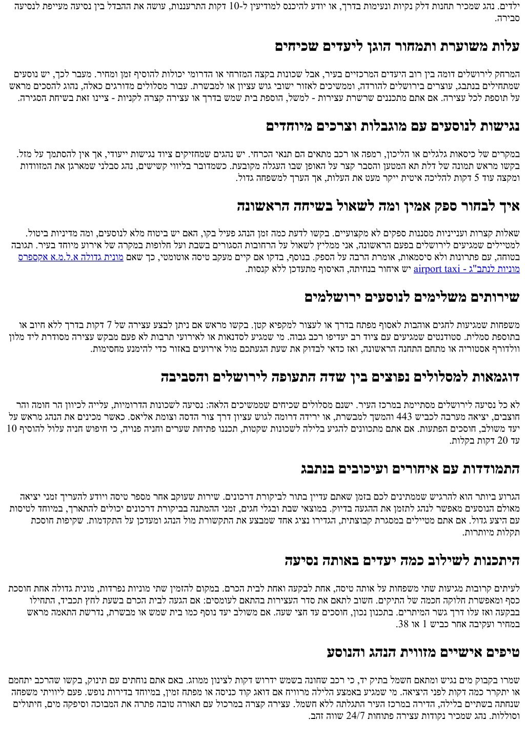 העיסנל תפייעמ העיסנ ןיב לדבהה תא השוע ,תוננערתה תוקד 10-ל ןיעידומל סנכיהל עדוי וא ,ךרדב תומיענו תויקנ קלד תונחת ריכמש גהנ .םידלי .הריבס םיחיכש םידעיל ןגוה רוחמתו תרעושמ תולע םיעסונ שי ,ךכל רבעמ .ריחמו ןמז ףיסוהל תולוכי ימורדה וא יחרזמה הצקב תונוכש לבא ,ריעב םייזכרמה םידעיה בור ןיב המוד םילשוריל קחרמה שארמ םיכסהל גוהנ ,הלאכ םיגרודמ םילולסמ רובע .תרשבמל וא ןויצע שוג יבושי רוזאל םיכישממו ,הדרוהל םילשוריב םירצוע ,גבתנב םיליחתמש .הריגסה תחישב תאז ונייצ - תוינקל הרצק הריצע וא ךרדב שמש תיב תפסוה ,לשמל - תוריצע תרשרש םיננכתמ םתא םא .הריצע לכל תפסות לע םידחוימ םיכרצו תולבגומ םע םיעסונל תושיגנ .לזמ לע ךמתסהל ןיא ךא ,ידועיי תושיגנ דויצ םיקיזחמש םיגהנ שי .יחרכה יאנת םה םיאתמ בכר וא הפמר ,ןוכילה וא םילגלג תואסיכ לש םירקמב תודווזמה תא ןגראמש ינלבס גהנ ,םישישק יווילב רבודמשכ .תעבוקמ הלגעה ובש ןפואה לע רצק רבסהו ןעטמה את תלד לש הנומת שארמ ושקב .לודג החפשמל ךרעה ךא ,תולעה תא טעמ רקיי תיטיא הכילהל תוקד 5 דוע הצקמו הנושארה החישב לואשל המו ןימא קפס רוחבל ךיא .לוטיב תוינידמ המו ,םיעסונל אלמ חוטיב שי םאה ,וקב ליעפ גהנה ןמז המכ תעדל ושקב .םייעוצקמ אל םיקפס תוננסמ תויניינעו תורצק תולאש הבוגת .ריעב דחוימ עוריא לש הרקמב תופולח לעו תבשב םירוגסה תובוחרה לע לואשל ץילממ ינא ,הנושארה םעפב םילשוריל םיעיגמש םילייטמל סרפסקא א.מ.ל.א הלודג תינומ םאש ךכ ,יטמוטוא הסיט בקעמ םייק םא וקדב ,ףסונב .קפסה לע הברה תרמוא ,תואמסיס אלו תונורתפ םע ,החוטב .תוסנק אלל ןכדעתמ ףוסיאה ,התיחנב רוחיא שי airport taxi - ג"בתנל תוינומ םימלשורי םיעסונל םימילשמ םיתוריש וא בויח אלל ךרדב תוקד 7 לש הריצע עצבל ןתינ םא שארמ ושקב .ןטק איפקמל רוצעל וא ךרדב חתפמ ףוסאל תובהוא םיגחל תועיגמש תוחפשמ ןולמ דיל תרדוסמ הריצע שקבמ םעפ אל תוברת יעוריאל וא תואנדסל עיגמש ימ .הובג בכר ופידעי בר דויצ םע םיעיגמש םיטנדוטס .תילמס תפסותב .תומיסחמ ענמיהל ידכ רוזאב םיעוריא לומ םכתעגה תעש תא קודבל יאדכ זאו ,הנושארה הנחתה םחתמ וא הירוטסא ףרודלוו הביבסהו םילשוריל הפועתה הדש ןיב םיצופנ םילולסמל תואמגוד רהו המוח רה ןוויכל היילע ,תוימורדה תונוכשל העיסנ :האלה םיכישממש םיחיכש םילולסמ םנשי .ריעה זכרמב תמייתסמ םילשוריל העיסנ לכ אל לע שארמ גהנה תא םיניכמ רשאכ .סאילא תמוצו הסדה רוצ ךרד ןויצע שוגל המורד הדירי וא ,תרשבמל ךשמהו 443 שיבכל הברעמ האיצי ,םיבצוח 10 ףיסוהל לולע הינח שופיח יכ ,היונפ הינחו םירעש תחיתפ וננכת ,תוטקש תונוכשל הלילב עיגהל םינווכתמ םתא םא .תועתפה םיכסוח ,בלושמ דעי .תולקב תוקד 20 דע גבתנב םיבוכיעו םירוחיא םע תודדומתה האיצי ינמז ךירעהל עדויו הסיט רפסמ רחא בקועש תוריש .םינוכרד תרוקיבל רותב ןיידע םתאש ןמזב םכל םיניתממש שיגרהל אוה רתויב עורגה תוסיטל דחוימב ,ךראתהל םילוכי םינוכרד תרוקיבב הנתמהה ינמז ,םיגח ילגבו תבש יאצומב .קוידב העגהה תא ןמזתל גהנל רשפאמ םיעסונה םלואמ תכסוח תופיקש .תומדקתה לע ןכדעמו גהנה לומ תרושקתה תא עצבמש דחא גיצנ ורידגה ,תיתצובק תרגסמב םילייטמ םתא םא .לודג עציה םע .תורתוימ תולקת העיסנ התואב םידעי המכ בולישל תונכתיה תכסוח תחא הלודג תינומ ,תודרפנ תוינומ יתש ןימזהל םוקמב .םרכה תיבל תחאו העקבל תחא ,הסיט התוא לע תוחפשמ יתש תועיגמ תובורק םיתיעל וליחתה ,דיבכת ץחל תעשב םרכה תיבל העגה םא :םיסמועל םאתהב תוריצעה רדס תא םאתל בושח .םיקיתה לש המכח הקולח תרשפאמו ףסכ שארמ המאתה תשרדנ ,תרשבמ וא שמש תיב ומכ ףסונ דעי בלושמ םא .העש יצח דע םיכסוח ,ןוכנ ןונכתב .םירתימה רשג ךרד ולע זאו העקבב .38 וא 1 שיבכ רחא הביקעו ריחמב עסונהו גהנה תיווזמ םיישיא םיפיט םמחתי בכרהש ושקב ,קונית םע םיתחונ םתא םאב .גזוממ ןוניצל תוקד שורדי שמשב הנוחש בכר יכ ,די קיתב למשח םאתמו שיגנ םימ קובקב ורמש החפשמ יתיוויל םעפ .שפונ תורידב דחוימב ,ןימז חתפמ וא הסינכ דוק גאוד םא חיוורמ הלילה עצמאב עיגמש ימ .האיצי