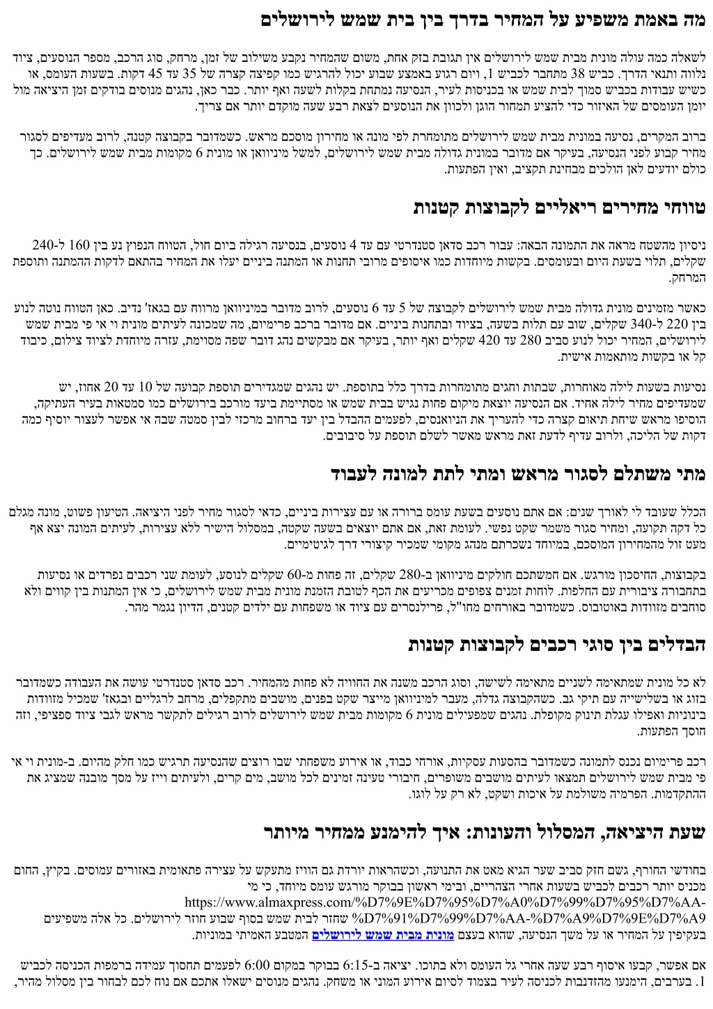 םילשוריל שמש תיב ןיב ךרדב ריחמה לע עיפשמ תמאב המ דויצ ,םיעסונה רפסמ ,בכרה גוס ,קחרמ ,ןמז לש בולישמ עבקנ ריחמהש םושמ ,תחא קזב תבוגת ןיא םילשוריל שמש תיבמ תינומ הלוע המכ הלאשל וא ,סמועה תועשב .תוקד 45 דע 35 לש הרצק הציפק ומכ שיגרהל לוכי עובש עצמאב עוגר םויו ,1 שיבכל רבחתמ 38 שיבכ .ךרדה יאנתו הוולנ לומ האיציה ןמז םיקדוב םיסונמ םיגהנ ,ןאכ רבכ .רתוי ףאו העשל תולקב תחתמנ העיסנה ,ריעל תוסינכב וא שמש תיבל ךומס שיבכב תודובע שישכ .ךירצ םא רתוי םדקומ העש עבר תאצל םיעסונה תא ןווכלו ןגוה רוחמת עיצהל ידכ רוזיאה לש םיסמועה ןמוי רוגסל םיפידעמ בורל ,הנטק הצובקב רבודמשכ .שארמ םכסומ ןוריחמ וא הנומ יפל תרחמותמ םילשוריל שמש תיבמ תינומב העיסנ ,םירקמה בורב ךכ .םילשוריל שמש תיבמ תומוקמ 6 תינומ וא ןאווינימ לשמל ,םילשוריל שמש תיבמ הלודג תינומב רבודמ םא רקיעב ,העיסנה ינפל עובק ריחמ .תועתפה ןיאו ,ביצקת תניחבמ םיכלוה ןאל םיעדוי םלוכ תונטק תוצובקל םיילאיר םיריחמ יחווט 240-ל 160 ןיב ענ ץופנה חווטה ,לוח םויב הליגר העיסנב ,םיעסונ 4 דע םע יטרדנטס ןאדס בכר רובע :האבה הנומתה תא הארמ חטשהמ ןויסינ תפסותו הנתמהה תוקדל םאתהב ריחמה תא ולעי םייניב הנתמה וא תונחת יבורמ םיפוסיא ומכ תודחוימ תושקב .םיסמועבו םויה תעשב יולת ,םילקש .קחרמה עונל הטונ חווטה ןאכ .בידנ 'זאגב םע חוורמ ןאווינימב רבודמ בורל ,םיעסונ 6 דע 5 לש הצובקל םילשוריל שמש תיבמ הלודג תינומ םינימזמ רשאכ שמש תיבמ יפ יא יו תינומ םיתיעל הנוכמש המ ,םוימירפ בכרב רבודמ םא .םייניב תונחתבו דויצב ,העשב תולת םע בוש ,םילקש 340-ל 220 ןיב דוביכ ,םוליצ דויצל תדחוימ הרזע ,תמיוסמ הפש רבוד גהנ םישקבמ םא רקיעב ,רתוי ףאו םילקש 420 דע 280 ביבס עונל לוכי ריחמה ,םילשוריל .תישיא תומאתומ תושקב וא לק שי ,זוחא 20 דע 10 לש העובק תפסות םירידגמש םיגהנ שי .תפסותב ללכ ךרדב תורחמותמ םיגחו תותבש ,תורחואמ הליל תועשב תועיסנ ,הקיתעה ריעב תואטמס ומכ םילשוריב בכרומ דעיב תמייתסמ וא שמש תיבב שיגנ תוחפ םוקימ תאצוי העיסנה םא .דיחא הליל ריחמ םיפידעמש המכ ףיסוי רוצעל רשפא יא הבש הטמס ןיבל יזכרמ בוחרב דעי ןיב לדבהה םימעפל ,םיסנאוינה תא ךירעהל ידכ הרצק םואית תחיש שארמ ופיסוה .םיבוביס לע תפסות םלשל רשאמ שארמ תאז תעדל ףידע בורלו ,הכילה לש תוקד דובעל הנומל תתל יתמו שארמ רוגסל םלתשמ יתמ םלגמ הנומ ,טושפ ןועיטה .האיציה ינפל ריחמ רוגסל יאדכ ,םייניב תוריצע םע וא הרורב סמוע תעשב םיעסונ םתא םא :םינש ךרואל יל דבועש ללכה ףא אצי הנומה םיתיעל ,תוריצע אלל רישיה לולסמב ,הטקש העשב םיאצוי םתא םא ,תאז תמועל .ישפנ טקש רמשמ רוגס ריחמו ,העוקת הקד לכ .םיימיטיגל ךרד ירוציק ריכמש ימוקמ גהנמ םתרכשנ דחוימב ,םכסומה ןוריחמהמ לוז טעמ תועיסנ וא םידרפנ םיבכר ינש תמועל ,עסונל םילקש 60-מ תוחפ הז ,םילקש 280-ב ןאווינימ םיקלוח םכתשמח םא .שגרומ ןוכסיחה ,תוצובקב אלו םיווק ןיב תונתמה ןיא יכ ,םילשוריל שמש תיבמ תינומ תנמזה תבוטל ףכה תא םיעירכמ םיפופצ םינמז תוחול .תופלחה םע תירוביצ הרובחתב .רהמ רמגנ ןוידה ,םינטק םידלי םע תוחפשמ וא דויצ םע םירסנלירפ ,ל"וחמ םיחרואב רבודמשכ .סובוטואב תודווזמ םיבחוס תונטק תוצובקל םיבכר יגוס ןיב םילדבה רבודמשכ הדובעה תא השוע יטרדנטס ןאדס בכר .ריחמהמ תוחפ אל היווחה תא הנשמ בכרה גוסו ,השישל המיאתמ םיינשל המיאתמש תינומ לכ אל תודווזמ ליכמש 'זאגבו םיילגרל בחרמ ,םילפקתמ םיבשומ ,םינפב טקש רציימ ןאווינימל רבעמ ,הלדג הצובקהשכ .בג יקית םע היישילשב וא גוזב הזו ,יפיצפס דויצ יבגל שארמ רשקתל םיליגר בורל םילשוריל שמש תיבמ תומוקמ 6 תינומ םיליעפמש םיגהנ .תלפוקמ קונית תלגע וליפאו תוינוניב .תועתפה ךסוח יא יו תינומ-ב .םויהמ קלח ומכ שיגרת העיסנהש םיצור ובש יתחפשמ עוריא וא ,דובכ יחרוא ,תויקסע תועסהב רבודמשכ הנומתל סנכנ םוימירפ בכר תא גיצמש הנבומ ךסמ לע זייו םיתיעלו ,םירק םימ ,בשומ לכל םינימז הניעט ירוביח ,םירפושמ םיבשומ םיתיעל ואצמת םילשוריל שמש תיבמ יפ .וגול לע קר אל ,