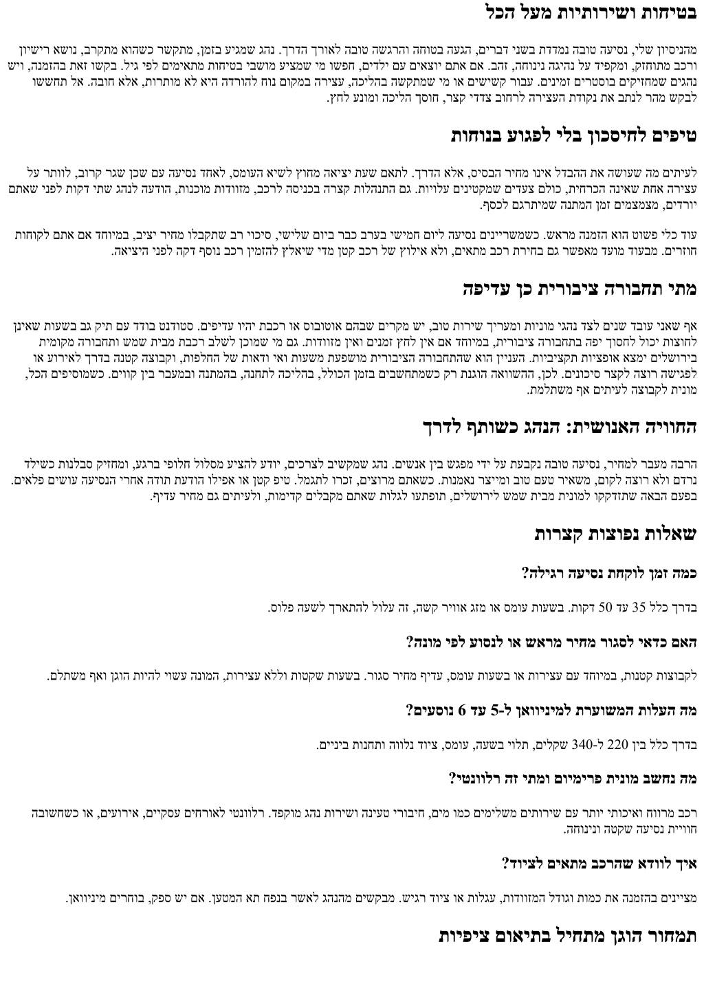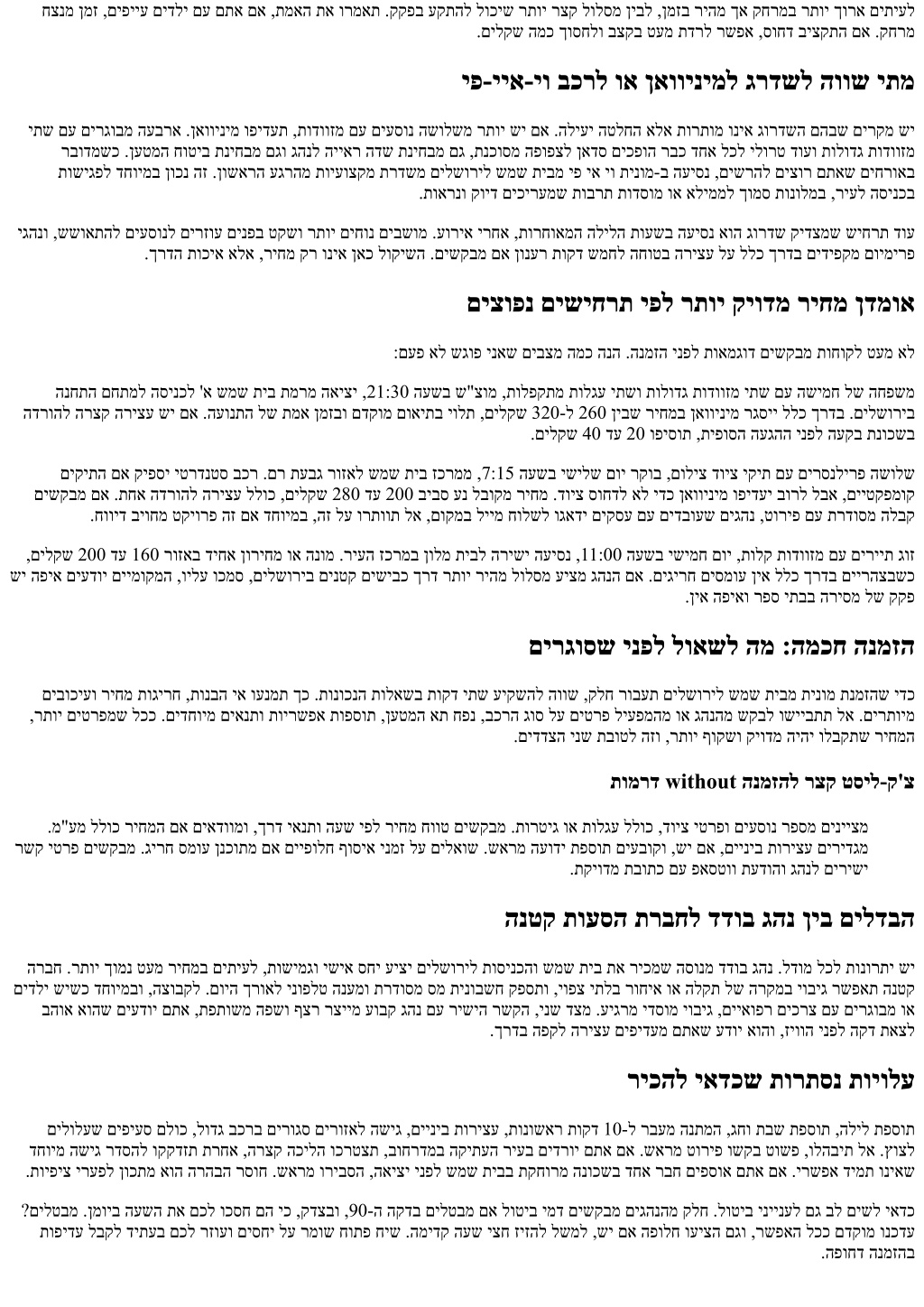 חצנמ ןמז ,םיפייע םידלי םע םתא םא ,תמאה תא ורמאת .קקפב עקתהל לוכיש רתוי רצק לולסמ ןיבל ,ןמזב ריהמ ךא קחרמב רתוי ךורא םיתיעל .םילקש המכ ךוסחלו בצקב טעמ תדרל רשפא ,סוחד ביצקתה םא .קחרמ יפ-ייא-יו בכרל וא ןאווינימל גרדשל הווש יתמ יתש םע םירגובמ העברא .ןאווינימ ופידעת ,תודווזמ םע םיעסונ השולשמ רתוי שי םא .הליעי הטלחה אלא תורתומ וניא גורדשה םהבש םירקמ שי רבודמשכ .ןעטמה חוטיב תניחבמ םגו גהנל הייאר הדש תניחבמ םג ,תנכוסמ הפופצל ןאדס םיכפוה רבכ דחא לכל ילורט דועו תולודג תודווזמ תושיגפל דחוימב ןוכנ הז .ןושארה עגרהמ תויעוצקמ תרדשמ םילשוריל שמש תיבמ יפ יא יו תינומ-ב העיסנ ,םישרהל םיצור םתאש םיחרואב .תוארנו קויד םיכירעמש תוברת תודסומ וא אליממל ךומס תונולמב ,ריעל הסינכב יגהנו ,ששואתהל םיעסונל םירזוע םינפב טקשו רתוי םיחונ םיבשומ .עוריא ירחא ,תורחואמה הלילה תועשב העיסנ אוה גורדש קידצמש שיחרת דוע .ךרדה תוכיא אלא ,ריחמ קר וניא ןאכ לוקישה .םישקבמ םא ןונער תוקד שמחל החוטב הריצע לע ללכ ךרדב םידיפקמ םוימירפ םיצופנ םישיחרת יפל רתוי קיודמ ריחמ ןדמוא :םעפ אל שגופ ינאש םיבצמ המכ הנה .הנמזה ינפל תואמגוד םישקבמ תוחוקל טעמ אל הנחתה םחתמל הסינכל 'א שמש תיב תמרמ האיצי ,21:30 העשב ש"צומ ,תולפקתמ תולגע יתשו תולודג תודווזמ יתש םע השימח לש החפשמ הדרוהל הרצק הריצע שי םא .העונתה לש תמא ןמזבו םדקומ םואיתב יולת ,םילקש 320-ל 260 ןיבש ריחמב ןאווינימ רגסיי ללכ ךרדב .םילשוריב .םילקש 40 דע 20 ופיסות ,תיפוסה העגהה ינפל העקב תנוכשב םיקיתה םא קיפסי יטרדנטס בכר .םר תעבג רוזאל שמש תיב זכרממ ,7:15 העשב ישילש םוי רקוב ,םוליצ דויצ יקית םע םירסנלירפ השולש םישקבמ םא .תחא הדרוהל הריצע ללוכ ,םילקש 280 דע 200 ביבס ענ לבוקמ ריחמ .דויצ סוחדל אל ידכ ןאווינימ ופידעי בורל לבא ,םייטקפמוק .חוויד ביוחמ טקיורפ הז םא דחוימב ,הז לע ורתוות לא ,םוקמב ליימ חולשל וגאדי םיקסע םע םידבועש םיגהנ ,טוריפ םע תרדוסמ הלבק ,םילקש 200 דע 160 רוזאב דיחא ןוריחמ וא הנומ .ריעה זכרמב ןולמ תיבל הרישי העיסנ ,11:00 העשב ישימח םוי ,תולק תודווזמ םע םיריית גוז שי הפיא םיעדוי םיימוקמה ,וילע וכמס ,םילשוריב םינטק םישיבכ ךרד רתוי ריהמ לולסמ עיצמ גהנה םא .םיגירח םיסמוע ןיא ללכ ךרדב םיירהצבשכ .ןיא הפיאו רפס יתבב הריסמ לש קקפ םירגוסש ינפל לואשל המ :המכח הנמזה םיבוכיעו ריחמ תוגירח ,תונבה יא וענמת ךכ .תונוכנה תולאשב תוקד יתש עיקשהל הווש ,קלח רובעת םילשוריל שמש תיבמ תינומ תנמזהש ידכ ,רתוי םיטרפמש לככ .םידחוימ םיאנתו תוירשפא תופסות ,ןעטמה את חפנ ,בכרה גוס לע םיטרפ ליעפמהמ וא גהנהמ שקבל ושייבתת לא .םירתוימ .םידדצה ינש תבוטל הזו ,רתוי ףוקשו קיודמ היהי ולבקתש ריחמה תומרד without הנמזהל רצק טסיל-ק'צ .מ"עמ ללוכ ריחמה םא םיאדוומו ,ךרד יאנתו העש יפל ריחמ חווט םישקבמ .תורטיג וא תולגע ללוכ ,דויצ יטרפו םיעסונ רפסמ םינייצמ רשק יטרפ םישקבמ .גירח סמוע ןנכותמ םא םייפולח ףוסיא ינמז לע םילאוש .שארמ העודי תפסות םיעבוקו ,שי םא ,םייניב תוריצע םירידגמ .תקיודמ תבותכ םע פאסטוו תעדוהו גהנל םירישי הנטק תועסה תרבחל דדוב גהנ ןיב םילדבה הרבח .רתוי ךומנ טעמ ריחמב םיתיעל ,תושימגו ישיא סחי עיצי םילשוריל תוסינכהו שמש תיב תא ריכמש הסונמ דדוב גהנ .לדומ לכל תונורתי שי םידלי שישכ דחוימבו ,הצובקל .םויה ךרואל ינופלט הנעמו תרדוסמ סמ תינובשח קפסתו ,יופצ יתלב רוחיא וא הלקת לש הרקמב יוביג רשפאת הנטק בהוא אוהש םיעדוי םתא ,תפתושמ הפשו ףצר רציימ עובק גהנ םע רישיה רשקה ,ינש דצמ .עיגרמ ידסומ יוביג ,םייאופר םיכרצ םע םירגובמ וא .ךרדב הפקל הריצע םיפידעמ םתאש עדוי אוהו ,זיווה ינפל הקד תאצל ריכהל יאדכש תורתסנ תויולע םילולעש םיפיעס םלוכ ,לודג בכרב םירוגס םירוזאל השיג ,םייניב תוריצע ,תונושאר תוקד 10-ל רבעמ הנתמה ,גחו תבש תפסות ,הליל תפסות דחוימ השיג רדסהל וקקדזת תרחא ,הרצק הכילה וכרטצת ,בוחרדמב הקיתעה ריעב םידרוי םתא םא .שארמ טוריפ ושקב טושפ ,ולהבית לא .ץוצל .תויפיצ 