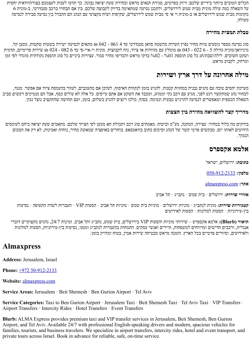 תיסחי תיאדווהרוצב םכמצעל תונעל ועדת ךכ .הנובנ האיצי תעש תריחבו שארמ םיאנת תריגס ,םיטרפב קויד :םכלש םיידיב רתויב םיבוטה םילכה 6 תינומ-ב ,יטרדנטס בכרב ורחבת םא ןיב .םכלש הצובקל קוידב המיאתמש העיסנ ןנכתלו ,םילשוריל שמש תיבמ תינומ הלוע המכ הלאשה לע העיסנל הריבס העיסנ ןיב לדבהה םה גהנה םע יעוצקמ חישו תופיקש ,םילשוריל שמש תיבמ יפ יא יו תינומ-ב וא םילשוריל שמש תיבמ תומוקמ .הלועמ הריהמ תיצמת תלבט .לק ןעטמ ,תוטקש תועשב הרישי העיסנל םיאתמ ₪ 042 - 061 4 דע יטרדנטס ןאדס חטשהמ תורעה ץופנ ריחמ חווט םיעסונ רפסמ העיסנ גוס תימדת ,םוימירפ תוריש ₪ 024 - 082 6 דע יפ-ייא-יו תינומ .תוצובקל חונ ,דויצ וא תודווזמ םע ץלמומ ₪ 043 - 022 6 - 5 הלודג תינומ/ןאווינימ ןמז יפל רדגומ תיתדוקנ תפסות גוס לכ םייניב תוריצע .רוגס ריחמ ופידעהו שארמ וקדב %02 - %01 תפסות גוס לכ גח/תבש/הליל .םיבושח טקשו .שארמ עובקל ,קחרמו תורישו ץרא ךרד לע הנורחא הלימ ,דגנמ .רשפא םא דויצ תסמעהב רוזעל ,םיבכעתמ םא ןכדעל ,ףוסיאה תדוקנל ןמזב עיגהל .תונטק תווחמב תינבנ םיגהנ םע הבוט םיסחי תכרעמ ביבס םישער םיכימנמ םה לבא ,ףסכ םילוע אל הלא לכ .םיפייע םתא םא טקשה תא דבכמו ,גזוממו יקנ בכר םע עיגמ ,ינפל עגר רשקתמש גהנ רוחבל .ןוכנ לצונ ביצקתהש השוחת םעו ,ןמזב ,םולשב עיגהל םיצור ונלוכ ,ףוסב .המיענו תיעבט שיגרהל העיסנל םירשפאמו תיפסכה הלאשה תועצה ןיב הריהמ האוושהל רצק ךירדמ םיסמועל סחיב האיצי תעש םימאתמ .םכלש דויצה יפל ןעטמ את תלוכתו בכר גוס םיתמאמ .חוטיבו מ"עמ ,הנתמה ,הריצע :ריחמב לולכ המ םיקדוב םוכסה תא קר אל ,תונימאו תוחונ ,ריחמ תנזאמש היצפואב םירחוב .פאסטאווב בותכ םוכיסו גהנה לש רשק יטרפ םישקבמ .םוי ותואל םיעודיה .ךומנה סרפסקא אמלא לארשי ,םילשורי :תבותכ 050-912-2133:ןופלט almaxpress.com:רתא ביבא לת · ג״בתנ · שמש תיב · םילשורי :תוריש ירוזא תועיסנ · הפועתה הדשל תורבעה · VIP תועסה · ביבא לת תוינומ · שמש תיב תוינומ · םילשורי תוינומ · ג״בתנל תינומ :תוריש תוירוגטק םיעוריאל תועסה · תונולמל תועסה · תוינוריע-ןיב ירבוד םייעוצקמ םיגהנ ,24/7 תונימז .ביבא לתו ג״בתנ ,שמש תיב ,םילשוריב VIP תועסהו תוינומ יתוריש – סרפסקא אמלא :(Blurb) רואית תונולמל תועסה ,תוינוריע-ןיב תועיסנ ,ונממו ג״בתנל תורבעהב תוחמתה .םיקסע ישנאו םיריית ,תוחפשמל םיחוורמו םישידח םיבכרו ,תילגנא .ןמזב קיודמו חוטב ,ןימא תוריש החיטבמ שארמ הנמזה .ץראה לכב םייטרפ םירויסו ,םיעוריאלו Almaxpress Address: Jerusalem, Israel Phone:+972 50-912-2133 Website:almaxpress.com Service Areas: Jerusalem · Beit Shemesh · Ben Gurion Airport · Tel Aviv Service Categories: Taxi to Ben Gurion Airport · Jerusalem Taxi · Beit Shemesh Taxi · Tel Aviv Taxi · VIP Transfers · Airport Transfers · Intercity Rides · Hotel Transfers · Event Transfers Blurb: ALMA Express provides premium taxi and VIP transfer services in Jerusalem, Beit Shemesh, Ben Gurion Airport, and Tel Aviv. Available 24/7 with professional English-speaking drivers and modern, spacious vehicles for families, tourists, and business travelers. We specialize in airport transfers, intercity rides, hotel and event transport, and private tours across Israel. Book in advance for reliable, safe, on-time service.