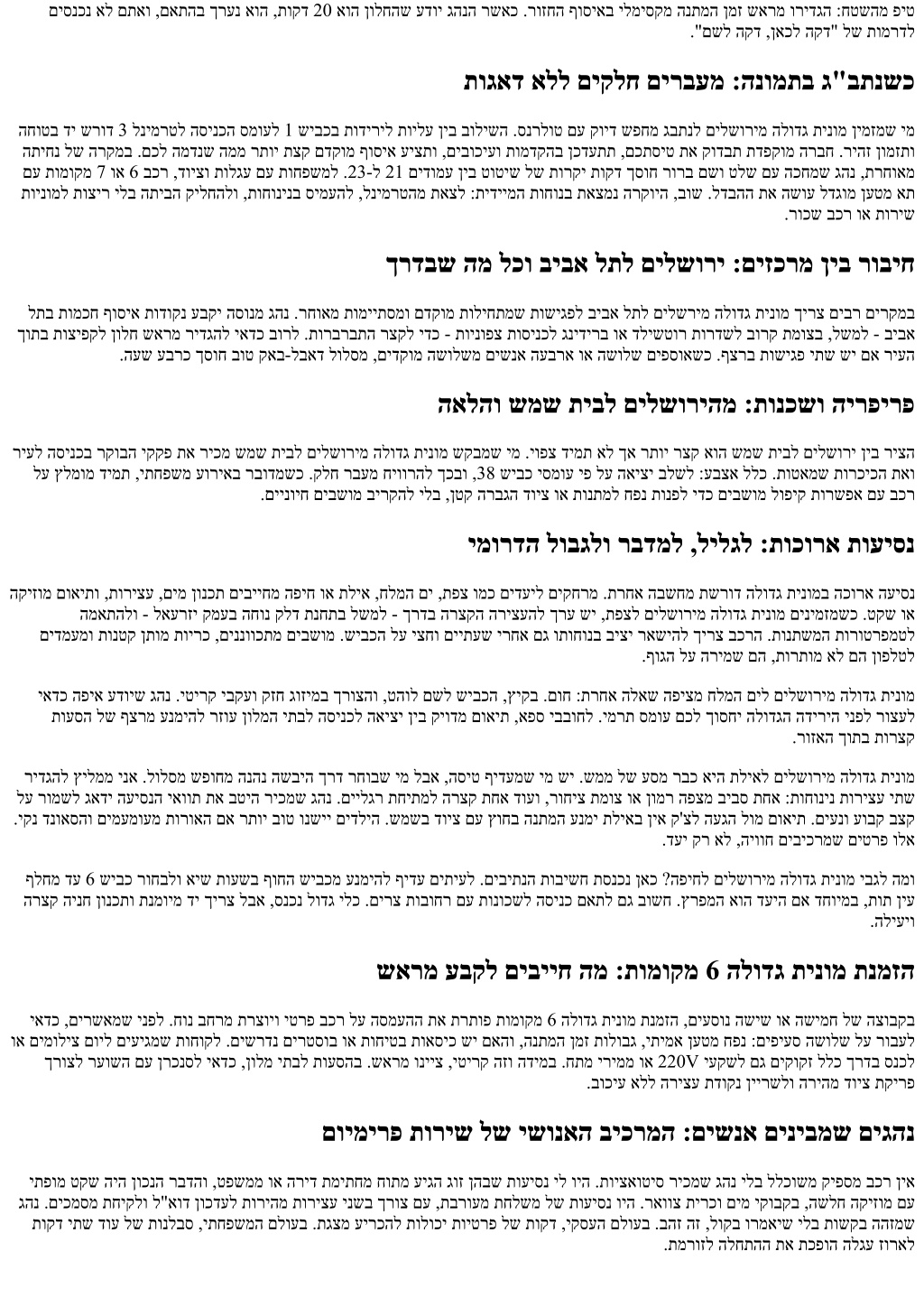 לדבהה תא השוע תמאב המ :םירעה ןיב ההובג המרב העיסנ ןונכתו ילועפת טקש ,תוחונ המכ דע עדוי הזה ריצה תא ריכמש ימ .ןמזב עיגהל קר אל איה הייפיצה ,םילשוריל ביבא לתמ הלודג תינומ םינימזמשכ ךופהל תולוכיש תוקד שמח ,תויולג ץוביק ףלחמ ביבס םינתשמ םיקקפ שי לעופב ךא ,הפמה לע טושפ הארנ 1 שיבכ .היווחה לכ לע םיעיפשמ קיודמ תוריש הנומתל סנכנ ןאכ .עוריאל וא השיגפל רהממש ימ םע ביטימ דימת אל ךא םיסמועב בשחתמש םירוזמר רטשמו ,איגה רעש ינפל העש יצחל השקבה דעו רתויב הנטקה הלאשהמ - תיתוריש תומידקב קיזחמו ,תמא ןמזב ביתנ ןכדעמ ,םיסנאוינה תא ריכמש גהנ םע ,הלודג תינומ לש םוימירפ .רתויב תבכרומה ןונכת ,ןמזב תחתפנש תלד ,ילאיר ןמז ןולח םע שארמ םואית :םינטקה םיטרפב הליחתמ איה .םירק םימ וא םיענ םיבשומ רועב תמכתסמ אל הרקויה .המר התואב רוזחו ךולה - תמייקתמש הטושפ החטבהו ,ךירצ םא םייניב תריצע םילגלג לע הטיווס לש המרב הלודג תינומ יהמ לכל תולודג תודווזמ יתשל םג קיפסמש ןעטמה את חפנמ לחה ,םיעסונה תא תדבכמש הרוצתב רבודמ .ןאווינימ דוע אל איה תיתוכיא הלודג תינומ גוזימו ,רישכמ לכל הריהמ הניעט ,בוט םישער דודיב םיפיסומשכ .סוחד שיגרהל ילב דיינ בשחמ לע דובעל רשפאמש םיילגר חוורמ דעו עסונ םיטרפה ,תוליעפ תועשב םילשוריל ביבא לת ןיב םומינימה הזו ,סולפ העש לש תועיסנב .תדיינ תוחונל עונישמ תכפוה העיסנה ,םירוזאל קלוחמש .םייתועמשמ וללה םג שי .ךימנהל יתמו חחושל יתמ גהנה לש הנבהו ,רשפאשכ ןולס ןונגסב הבישי ,םיהכ םיכסמ .תיתימא תויטרפ םיתיעל םישקבמ םייקסע תוחוקל גהנ .החונ קלד תנחתב וא לארה ןוינקב הרצק הקספהו תוחיטב בשומל הנכה ,ןובכרל השיג ,םידליל תושיגנ ןיב בוליש תושפחמש תויתחפשמ תוצובק .םינמזה תא וסרהי אלש תוריצע םקמל עדוי חטשה תא ריכמש הרזח ךרדב םג ההז תוריש ףצר ותוא ושוריפ המר התואב רוזחו ךולה .םיטרדנטס ףילחהל הז םישפחמש ןורחאה רבדהו ,הלש תא השוע תופייעה .ןחבמ איה ךורא םוי םותב הרזח ,קיודמ ףוסיא ןולח :רדוסמ םואיתל בר ךרע שי .עבקתה שיבכה םא הפוקש תרושקתו ,קויד ילהנ םתוא ,רשפא םא גהנ ותוא ,ליבקמ וא בכר גוס םחתמב עוריא וא תוברתה לכיהב העפוה ירחא לשמל ,תחרמנ האיציהשכ .טווינל רושיק םע גהנה םשו ,פאסטאוו תעדוהב ךלומ רשואמש טולס .יבצעו ילכלכ ןורתי אוה תפסונ תוחוקל תרשרשב ץחל ול ןיאו ןימז ראשנש גהנה ,םילשוריב הנחתה םייופצ יתלב םיבצמבו ,תולמעב דיבכהל ילבמ ינפל םייתעש דע לוטיב - ריבס ןורמת בחרמ תתל תועדוי תויניצר תורבח .לוטיבה אשונ סנכנ םג ןאכ .הנטק החנהמ רתוי הברה הווש הזה טקשה .יקלח יוכיז םע תושימג םילשורי - ביבא לת תא ןוכנ םיננכתמ ךיא :המסיס אל אוה םינמזב קויד איה ילש הצלמהה ,9:30-ל 7:00 ןיב ,רקובב .העש לכב טעמכ הנתשמ העיסנה ךשמ לבא ,רטמוליק 65 ביבס ענ םילשוריל ביבא לת ןיב קחרמה תוילעב םיטאמ םימעפל םיכורא אשמ יבכר ,חתפנ שיבכהשכ ,ברעב .לגה ינפל תאצל וא ,תולחתשהה תא רצקל ידכ ביבא לת לש יחרזמה דצב ףוסאל םע גהנ .הנמזהה ןמזב עיצמ זייוובש המל רבעמ תוקד 30 דע 20 לש חוורמ בשחל יאדכ ,ךורכ ןמז םע השיגפ וא הסיט םכל שי םא .אצומ ןוויכל .םאתהב ביתנ רחביו ןויצ תרשבממ האיציה ביבס תורהנמה סמוע תא שארמ קודבי ןויסינ וא םידקהל עדויש ימו ,הרקויהמ יצח אוה םכח ןומזת ,םימי םתואב .העיסנ ןמז ליפכהל לוכי גח ברע .האוושמה תא םינשמ םיגח וא םירעוס םימי .ישפנ טקש חיוורמ ,טעמ תוחדל ןאו תרכשה וא יטרפ בכר ינפ לע הלודג תינומ רוחבל יתמ ,הרזחה ,ףוסיא תשרוד ןאו תרכשה .לטב ןמזו םיבצע לומ תויולעב שרפהה ,םיעסונ 7 דע 4-ב רבודמשכ לבא .יטרפ בכרב עובק םיעסונש תוחוקל שי ןיב םואיתמ שושחל ךרוצ ןיא ,גוהנל ךרוצ ןיא :הלא לכ תא תרתופ יפ יא יו הלודג תינומ .ריעב הינח תוכבתסהו ,הצובקה ךותמ ידועיי גהנ ,םיחוטיב .םירע יזכרמ לש םייתרגש תוסנקל םכתא ףושחל ילבמ ,רתומש ןכיה קוידב בורק רוצעל עדוי גהנהו ,םיבכר םג .ספספל רשפא יאש םשור םירצוי תורישב תויבקעו ,בוט חיר ,יקנ בכר ,תוחלשמ חוריאב וא ןוירוטקריד תושיגפב .תויגוצייה תמר איה הדוקנ דוע .