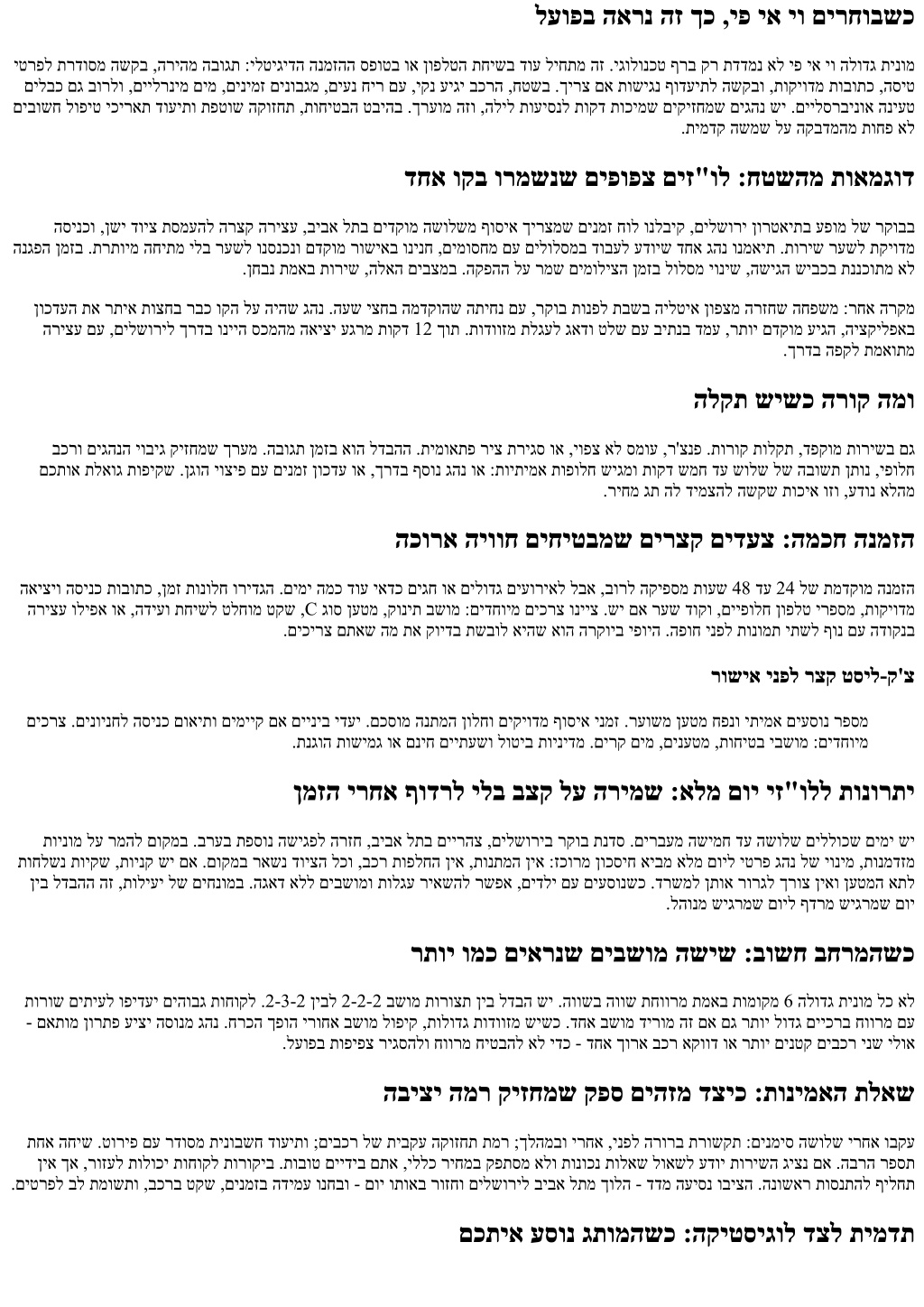 לעופב הארנ הז ךכ ,יפ יא יו םירחובשכ יטרפל תרדוסמ השקב ,הריהמ הבוגת :ילטיגידה הנמזהה ספוטב וא ןופלטה תחישב דוע ליחתמ הז .יגולונכט ףרב קר תדדמנ אל יפ יא יו הלודג תינומ םילבכ םג בורלו ,םיילרנימ םימ ,םינימז םינובגמ ,םיענ חיר םע ,יקנ עיגי בכרה ,חטשב .ךירצ םא תושיגנ ףודעיתל השקבו ,תוקיודמ תובותכ ,הסיט םיבושח לופיט יכיראת דועיתו תפטוש הקוזחת ,תוחיטבה טביהב .ךרעומ הזו ,הליל תועיסנל תוקד תוכימש םיקיזחמש םיגהנ שי .םיילסרבינוא הניעט .תימדק השמש לע הקבדמהמ תוחפ אל דחא וקב ורמשנש םיפופצ םיז"ול :חטשהמ תואמגוד הסינכו ,ןשי דויצ תסמעהל הרצק הריצע ,ביבא לתב םידקומ השולשמ ףוסיא ךירצמש םינמז חול ונלביק ,םילשורי ןורטאיתב עפומ לש רקובב הנגפה ןמזב .תרתוימ החיתמ ילב רעשל ונסנכנו םדקומ רושיאב ונינח ,םימוסחמ םע םילולסמב דובעל עדויש דחא גהנ ונמאית .תוריש רעשל תקיודמ .ןחבנ תמאב תוריש ,הלאה םיבצמב .הקפהה לע רמש םימוליצה ןמזב לולסמ יוניש ,השיגה שיבכב תננכותמ אל ןוכדעה תא רתיא תוצחב רבכ וקה לע היהש גהנ .העש יצחב המדקוהש התיחנ םע ,רקוב תונפל תבשב הילטיא ןופצמ הרזחש החפשמ :רחא הרקמ הריצע םע ,םילשוריל ךרדב ונייה סכמהמ האיצי עגרמ תוקד 12 ךות .תודווזמ תלגעל גאדו טלש םע ביתנב דמע ,רתוי םדקומ עיגה ,היצקילפאב .ךרדב הפקל תמאותמ הלקת שישכ הרוק המו בכרו םיגהנה יוביג קיזחמש ךרעמ .הבוגת ןמזב אוה לדבהה .תימואתפ ריצ תריגס וא ,יופצ אל סמוע ,ר'צנפ .תורוק תולקת ,דפקומ תורישב םג םכתוא תלאוג תופיקש .ןגוה יוציפ םע םינמז ןוכדע וא ,ךרדב ףסונ גהנ וא :תויתימא תופולח שיגמו תוקד שמח דע שולש לש הבושת ןתונ ,יפולח .ריחמ גת הל דימצהל השקש תוכיא וזו ,עדונ אלהמ הכורא היווח םיחיטבמש םירצק םידעצ :המכח הנמזה האיציו הסינכ תובותכ ,ןמז תונולח ורידגה .םימי המכ דוע יאדכ םיגח וא םילודג םיעוריאל לבא ,בורל הקיפסמ תועש 48 דע 24 לש תמדקומ הנמזה הריצע וליפא וא ,הדיעו תחישל טלחומ טקש ,C גוס ןעטמ ,קונית בשומ :םידחוימ םיכרצ ונייצ .שי םא רעש דוקו ,םייפולח ןופלט ירפסמ ,תוקיודמ .םיכירצ םתאש המ תא קוידב תשבול איהש אוה הרקויב יפויה .הפוח ינפל תונומת יתשל ףונ םע הדוקנב רושיא ינפל רצק טסיל-ק'צ םיכרצ .םינוינחל הסינכ םואיתו םימייק םא םייניב ידעי .םכסומ הנתמה ןולחו םיקיודמ ףוסיא ינמז .רעושמ ןעטמ חפנו יתימא םיעסונ רפסמ .תנגוה תושימג וא םניח םייתעשו לוטיב תוינידמ .םירק םימ ,םינעטמ ,תוחיטב יבשומ :םידחוימ ןמזה ירחא ףודרל ילב בצק לע הרימש :אלמ םוי יז"ולל תונורתי תוינומ לע רמהל םוקמב .ברעב תפסונ השיגפל הרזח ,ביבא לתב םיירהצ ,םילשוריב רקוב תנדס .םירבעמ השימח דע השולש םיללוכש םימי שי תוחלשנ תויקש ,תוינק שי םא .םוקמב ראשנ דויצה לכו ,בכר תופלחה ןיא ,תונתמה ןיא :זכורמ ןוכסיח איבמ אלמ םויל יטרפ גהנ לש יונימ ,תונמדזמ ןיב לדבהה הז ,תוליעי לש םיחנומב .הגאד אלל םיבשומו תולגע ריאשהל רשפא ,םידלי םע םיעסונשכ .דרשמל ןתוא רורגל ךרוצ ןיאו ןעטמה אתל .להונמ שיגרמש םויל ףדרמ שיגרמש םוי רתוי ומכ םיארנש םיבשומ השיש :בושח בחרמהשכ תורוש םיתיעל ופידעי םיהובג תוחוקל .2-3-2 ןיבל 2-2-2 בשומ תורוצת ןיב לדבה שי .הוושב הווש תחוורמ תמאב תומוקמ 6 הלודג תינומ לכ אל - םאתומ ןורתפ עיצי הסונמ גהנ .חרכה ךפוה ירוחא בשומ לופיק ,תולודג תודווזמ שישכ .דחא בשומ דירומ הז םא םג רתוי לודג םייכרב חוורמ םע .לעופב תופיפצ ריגסהלו חוורמ חיטבהל אל ידכ - דחא ךורא בכר אקווד וא רתוי םינטק םיבכר ינש ילוא הביצי המר קיזחמש קפס םיהזמ דציכ :תונימאה תלאש תחא החיש .טוריפ םע רדוסמ תינובשח דועיתו ;םיבכר לש תיבקע הקוזחת תמר ;ךלהמבו ירחא ,ינפל הרורב תרושקת :םינמיס השולש ירחא ובקע ןיא ךא ,רוזעל תולוכי תוחוקל תורוקיב .תובוט םיידיב םתא ,יללכ ריחמב קפתסמ אלו תונוכנ תולאש לואשל עדוי תורישה גיצנ םא .הברה רפסת .םיטרפל בל תמושתו ,בכרב טקש ,םינמזב הדימע ונחבו - םוי ותואב רוזחו םילשוריל ביבא לתמ ךולה - דדמ העיסנ וביצה .הנושאר תוסנתהל ףילחת םכתיא עסונ גתומהשכ :הקיטסיגול דצ