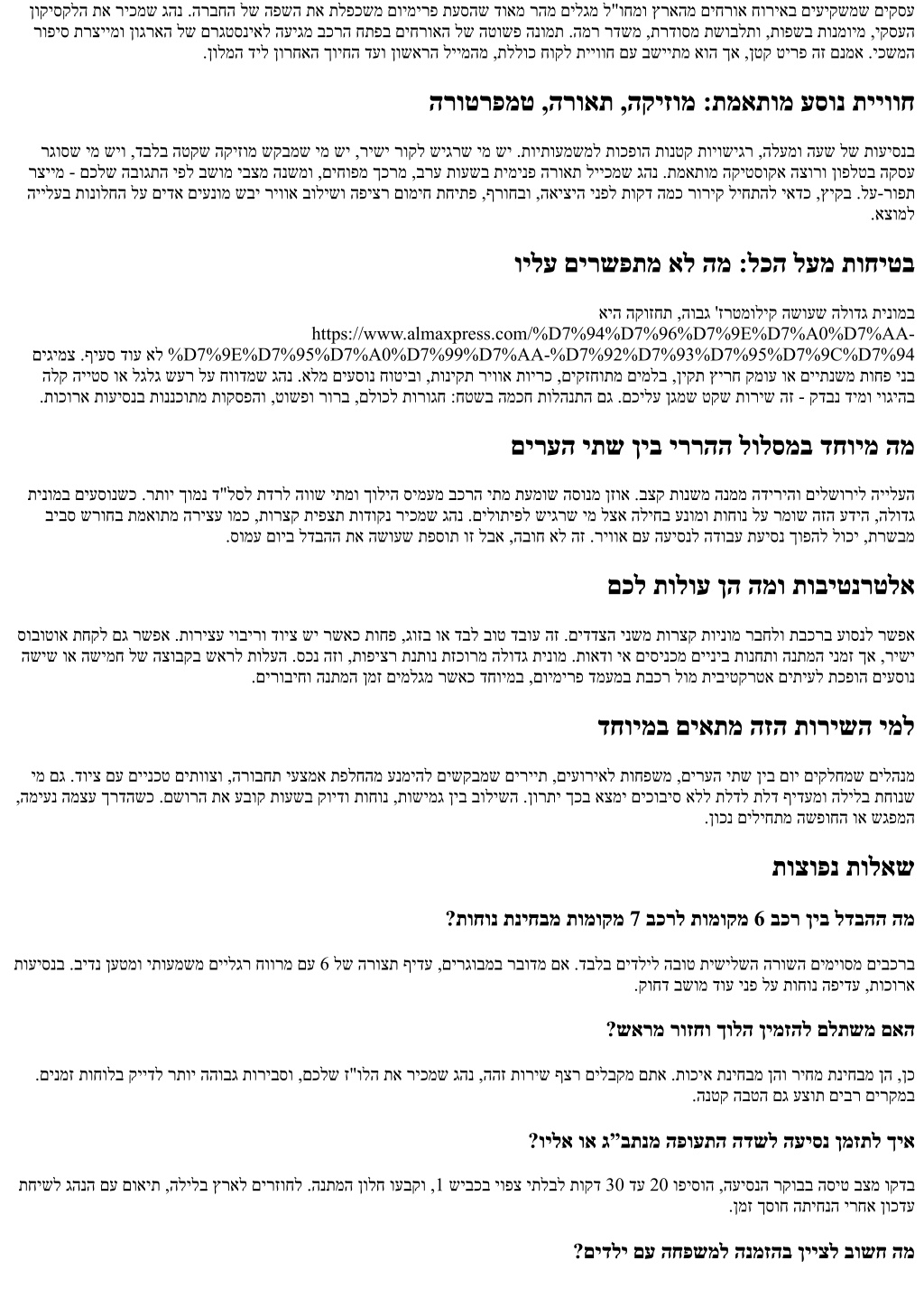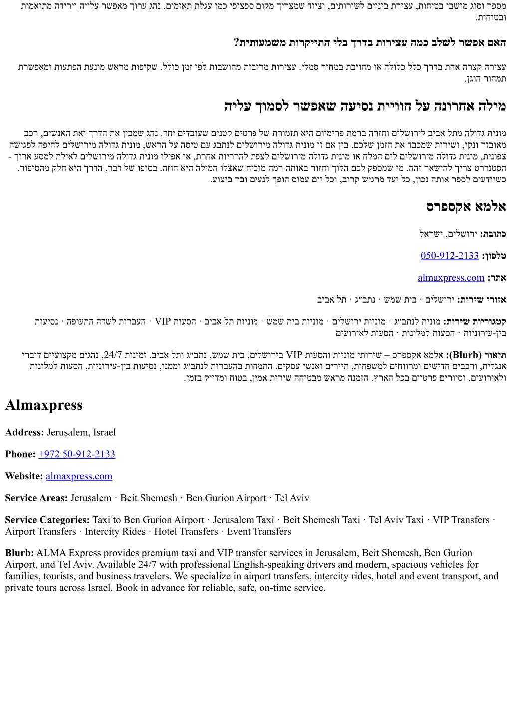 תומאותמ הדיריו היילע רשפאמ ךורע גהנ .םימואת תלגע ומכ יפיצפס םוקמ ךירצמש דויצו ,םיתורישל םייניב תריצע ,תוחיטב יבשומ גוסו רפסמ .תוחוטבו ?תיתועמשמ תורקייתה ילב ךרדב תוריצע המכ בלשל רשפא םאה תרשפאמו תועתפה תענומ שארמ תופיקש .ללוכ ןמז יפל תובשוחמ תובורמ תוריצע .ילמס ריחמב תביוחמ וא הלולכ ללכ ךרדב תחא הרצק הריצע .ןגוה רוחמת הילע ךומסל רשפאש העיסנ תייווח לע הנורחא הלימ בכר ,םישנאה תאו ךרדה תא ןיבמש גהנ .דחי םידבועש םינטק םיטרפ לש תרומזת איה םוימירפ תמרב הרזחו םילשוריל ביבא לתמ הלודג תינומ השיגפל הפיחל םילשורימ הלודג תינומ ,שארה לע הסיט םע גבתנל םילשורימ הלודג תינומ וז םא ןיב .םכלש ןמזה תא דבכמש תורישו ,יקנו רזבואמ - ךורא עסמל תליאל םילשורימ הלודג תינומ וליפא וא ,תרחא תויררהל תפצל םילשורימ הלודג תינומ וא חלמה םיל םילשורימ הלודג תינומ ,תינופצ .רופיסהמ קלח איה ךרדה ,רבד לש ופוסב .הזוח איה הלימה ולצאש חיכומ המר התואב רוזחו ךולה םכל קפסמש ימ .ההז ראשיהל ךירצ טרדנטסה .עוציב רבו םיענל ךפוה סומע םוי לכו ,בורק שיגרמ דעי לכ ,ןוכנ התוא רפסל םיעדוישכ סרפסקא אמלא לארשי ,םילשורי :תבותכ 050-912-2133:ןופלט almaxpress.com:רתא ביבא לת · ג״בתנ · שמש תיב · םילשורי :תוריש ירוזא תועיסנ · הפועתה הדשל תורבעה · VIP תועסה · ביבא לת תוינומ · שמש תיב תוינומ · םילשורי תוינומ · ג״בתנל תינומ :תוריש תוירוגטק םיעוריאל תועסה · תונולמל תועסה · תוינוריע-ןיב ירבוד םייעוצקמ םיגהנ ,24/7 תונימז .ביבא לתו ג״בתנ ,שמש תיב ,םילשוריב VIP תועסהו תוינומ יתוריש – סרפסקא אמלא :(Blurb) רואית תונולמל תועסה ,תוינוריע-ןיב תועיסנ ,ונממו ג״בתנל תורבעהב תוחמתה .םיקסע ישנאו םיריית ,תוחפשמל םיחוורמו םישידח םיבכרו ,תילגנא .ןמזב קיודמו חוטב ,ןימא תוריש החיטבמ שארמ הנמזה .ץראה לכב םייטרפ םירויסו ,םיעוריאלו Almaxpress Address: Jerusalem, Israel Phone:+972 50-912-2133 Website:almaxpress.com Service Areas: Jerusalem · Beit Shemesh · Ben Gurion Airport · Tel Aviv Service Categories: Taxi to Ben Gurion Airport · Jerusalem Taxi · Beit Shemesh Taxi · Tel Aviv Taxi · VIP Transfers · Airport Transfers · Intercity Rides · Hotel Transfers · Event Transfers Blurb: ALMA Express provides premium taxi and VIP transfer services in Jerusalem, Beit Shemesh, Ben Gurion Airport, and Tel Aviv. Available 24/7 with professional English-speaking drivers and modern, spacious vehicles for families, tourists, and business travelers. We specialize in airport transfers, intercity rides, hotel and event transport, and private tours across Israel. Book in advance for reliable, safe, on-time service.