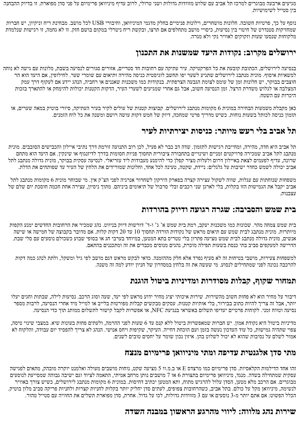 תושיגרו תונורתפ ,תולובג :םיגחו תותבשב תולהנתה תא םאתת גבתנמ תראופמ תינומ .זא אקווד ךירצש ימ שיו ,תבשב עוסנל אלש שקבמש ימ שי .םיגחו עובש יפוסב םינתשמ םינמזה תוחול ,לארשיב הינח ןיב םיצצוח תבשב םירוגס םירוזא ,לשמל ,םילשוריל .םימיוסמ םירוזאל הסינכ תולבגמ קודבתו ,ףירעת תפסות שי םא ןייצת ,שארמ שיחרתה רומשל תוחפל וא רעושמ העיסנ ןמז ליפכהל בושח ,גח ימיב .תיטרואת הדוקנ אלו שממ לש הדרוה תדוקנ תריחבל תובישח שי ןכלו ,לעופב הסינכל .ץחליהל ילב םיסמועה בחרמ תא לוכאל ידכ ,השיגפל התיחנ ןיב המישנ חוורמ תוהזל לקש תוכיא ינמיס השולש :קפס לש הנובנ הריחב שארמ םיחלשנש םיגהנ תומשו ,ריחמה תעצהב םגדו בכר יטרפ ,הריהמ תויובתכתה תונימז :םיטושפ םיביכרמ השולש ושפח ,רובנל ןמז םכל ןיאשכ םילשוריל וא שמש תיבל גבתנמ תומוקמ 6 תינומ םכל םיעיצמ םא .חטשב יתוכיא תוריש םג ןתונ דימת טעמכ ,תופיקש ןתונש ימ .ןופלט ירפסמ םע .ץוחב רבכ תולגעהשכ רתלאל תוסנל רשאמ דעומ דועבמ אדוול ףידע .המאתה רסוח חטשב ולגתש יוכיס שי ,ןעטמ אתו םיבשומ תרוצת ןייצל ילב טקש-ורקאמ םישועש םיטרפ-ורקימ ,ןגזמב ול רקש ימל הקד רמצ תכימש ,הליחב הווחי אלו ךרדה תא האריש ךכ דליה בשומ םוקימ :םינטק םיטרפ לש רצות אוה .הרקמב דלונ אל טקש הז .ךרדב יקנה םוקמה אצמנ הפיא קוידב םיעדויש םיתורישל תמאותמ הריצעו ,הסיט ירחא תופייע ירדת םע ןרכנתסמש ךומנ םוילווב הבידא הקיזומ .םישיבכמ תוחפ אל םישנא ןיבמש גהנ-ךירדמ לש תונמוימ וז ,יתרקוי קימיג אל תוצופנ תולאש ?ןימזהל יאדכ שארמ ןמז המכ גבתנמ תומוקמ 6 תינומ תשרדנ םא דחוימב ,םיאתמה בכר ילכ חיטבהל ידכ שארמ עובש ףא יאדכ ,איש תונועב .קפסמ תועש 48 דע 24 ,ליגרב .רשפאה לככ ומידקה ,גח םויב וא תרחואמ הליל תעשב רבודמ םא .ביבא לתל וא םילשוריל ?תוחיטב יבשומ יבגל המ ינפל ןוינחב רצק הנקתה ןמז שקבל ושייבתת לא .ןוכנ םינקתומו םיינקת םיבשומ תוקיזחמ תויתוכיא תורבח .לקשמו ליג רידגהלו שארמ שקבל שי .האיציה ?ךרדב תוריצע בלשל ןתינ םאה .שארמ םיעודי ריחמ וא ןמז תפסותב םיתעל ,םירקמה בורב תירשפא בורק תיבב דויצ תדרוה וא ימוקמ םיס ,הפקל הריצע .םדקומ םואיתב ,ןכ ?םוימירפ ןאווינימל תיתרקוי ןדס ןיב לדבהה המ הבישי חוורמ םע ,בר דויצו םיתווצ ,תוחפשמל םיאתמ ןאווינימ .ןעטמ טעמ םע םיעסונ השולש דע םיינשל תזכורמו הטקש עסונ תייווח העיצמ ןדס .דויצה תומכבו םיעסונה רפסמב היולת הריחבה .רתוי לודג ןעטמ אתו ?הסיטב רוחיא םע םידדומתמ ךיא יעצמא רשאל יאדכ .ןמזב ורסמנ םינוכדעה םא סנקב ואשית אל תנגוה תוינידמב .ףוסיאה תעש תא ןכדעמו הסיטה רפסמ ירחא בקוע יעוצקמ תוריש .גנימור אלל יפולח תרושקת םינימזמש ינפל הנורחא הלימ לולסמ תורציימש תונטק תוטלחה לש תכרעמ איה ,סוטטס למס קר אל איה גבתנמ תראופמ תינומ .עקרקה לע הנושארה הקדהמ הליחתמ הבוט העיסנ תינומ וא ,טקש שאר םע הילא עיגהל ךירצש השיגפל ביבא לתל גבתנמ תינומ ,תיתחפשמ תבשל םילשוריל גבתנמ תינומ וז םא ןיב .םירבשמ יקנ ךכ .םיכרצל השיגר ןיעו ,ףוקש רוחמת ,ןגומ ןולס ומכ שיגרמש בכר ,ןמזב עיגמש גהנ .םיטרפב דדמנ לדבהה ,םישרוש רוקיבל שמש תיבל גבתנמ .םכלש דעיה תאו ,םכתא תדבכמש העגה תיארנ סרפסקא אמלא לארשי ,םילשורי :תבותכ
