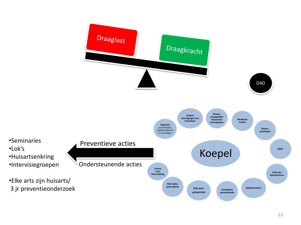 Draagkracht • Draaglast D4D • Seminaries • Lok’s • Huisartsenkring • Intervisiegroepen • Elke arts zijn huisarts/ • 3 jr preventieonderzoek Preventieve acties Ondersteunende acties