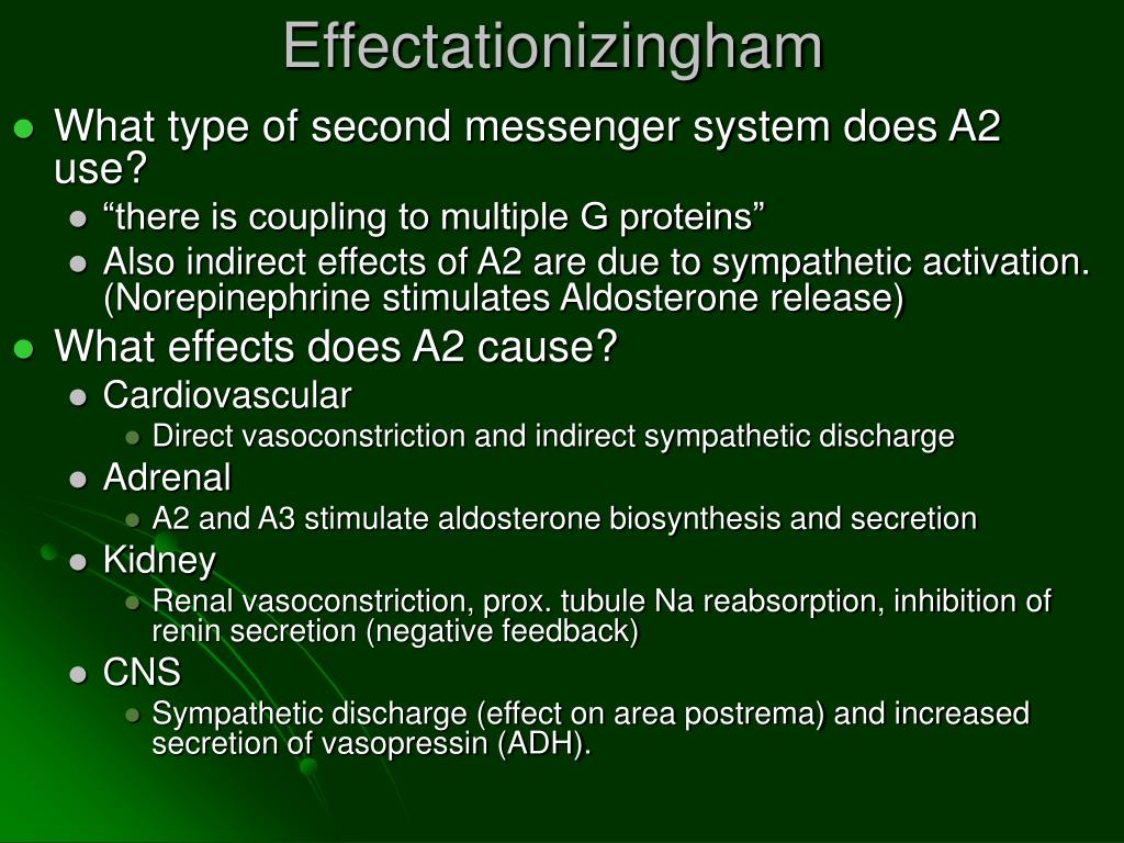 Effectationizingham • What type of second messenger system does A2 use? • “there is coupling to multiple G proteins” • Also indirect effects of A2 are due to sympathetic activation. (Norepinephrine stimulates Aldosterone release) • What effects does A2 cause? • Cardiovascular • Direct vasoconstriction and indirect sympathetic discharge • Adrenal • A2 and A3 stimulate aldosterone biosynthesis and secretion • Kidney • Renal vasoconstriction, prox. tubule Na reabsorption, inhibition of renin secretion (negative feedback) • CNS • Sympathetic discharge (effect on area postrema) and increased secretion of vasopressin (ADH).