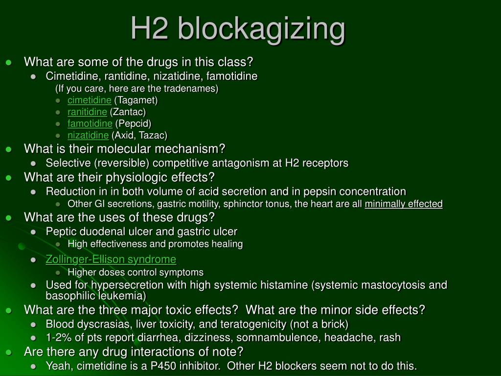 H2 blockagizing • What are some of the drugs in this class? • Cimetidine, rantidine, nizatidine, famotidine (If you care, here are the tradenames) • cimetidine (Tagamet) • ranitidine (Zantac) • famotidine (Pepcid) • nizatidine (Axid, Tazac) • What is their molecular mechanism? • Selective (reversible) competitive antagonism at H2 receptors • What are their physiologic effects? • Reduction in in both volume of acid secretion and in pepsin concentration • Other GI secretions, gastric motility, sphinctor tonus, the heart are all minimally effected • What are the uses of these drugs? • Peptic duodenal ulcer and gastric ulcer • High effectiveness and promotes healing • Zollinger-Ellison syndrome • Higher doses control symptoms • Used for hypersecretion with high systemic histamine (systemic mastocytosis and basophilic leukemia) • What are the three major toxic effects? What are the minor side effects? • Blood dyscrasias, liver toxicity, and teratogenicity (not a brick) • 1-2% of pts report diarrhea, dizziness, somnambulence, headache, rash • Are there any drug interactions of note? • Yeah, cimetidine is a P450 inhibitor. Other H2 blockers seem not to do this.