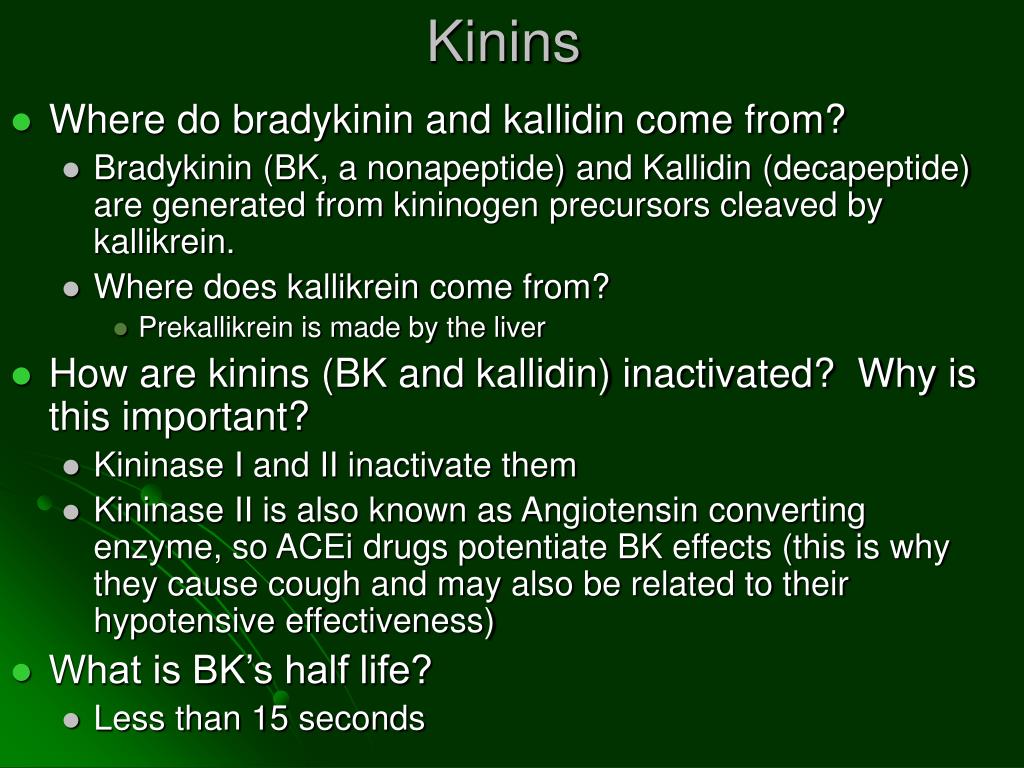 Kinin mechanism and effects • What is BK’s mechanism of action (receptor)? • BK works through two classes of membrane receptors BK1 and 2, of which BK2 is more important. Some effects are also mediated by prostaglandins. • What are BK’s effects? • Cardiovascular • Dilation of arterioles (10x potency of histamine), while veins and large arteries tend to contract • Increase in capillary permeabilityedema • Smooth muscle • Contraction of GI, bronchiolar, uterine smooth muscle • Peripheral nervous • Stimulation of sensory nerve endings and pain • Which of these effects cause ACEi drugs to produce a cough? • ACEi = increased BK = bronchoconstriction + stimulation of sensory nerve endings = cough • I promise not to mention that again • Are kinins mediators of acute inflammation and pain? • Yes • What is aprotinin used for? • Aprotinin is a proteinase inhibitor used in cardiopulmonary bypass surgery