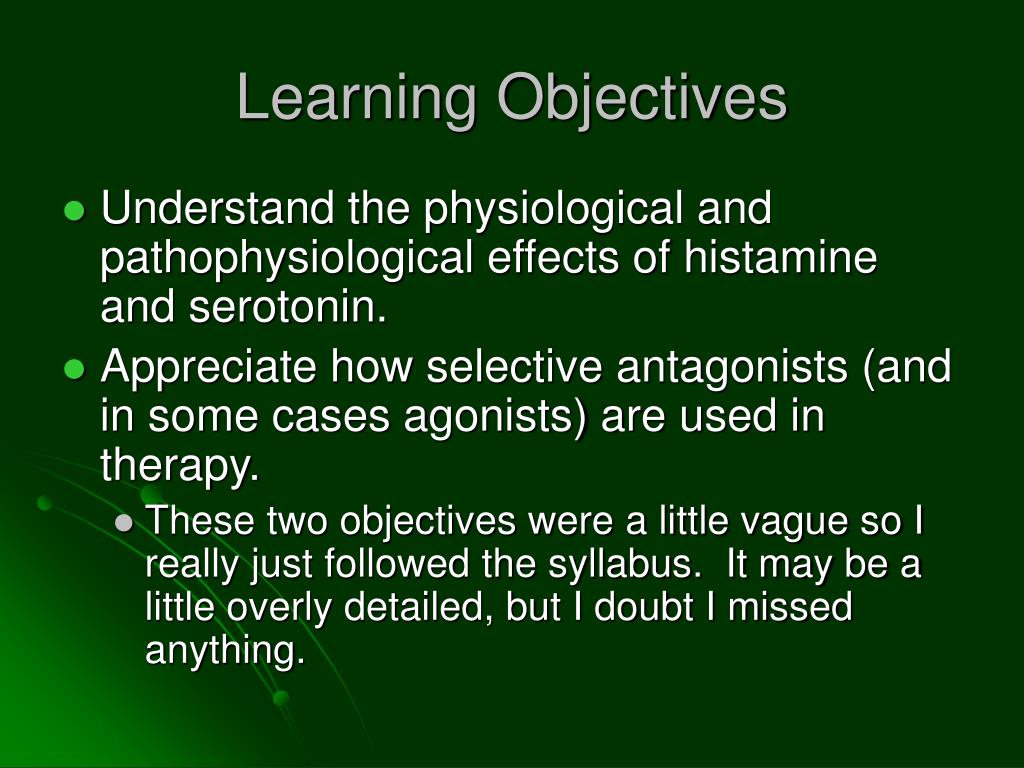 Learning Objectives • Understand the physiological and pathophysiological effects of histamine and serotonin. • Appreciate how selective antagonists (and in some cases agonists) are used in therapy. • These two objectives were a little vague so I really just followed the syllabus. It may be a little overly detailed, but I doubt I missed anything.