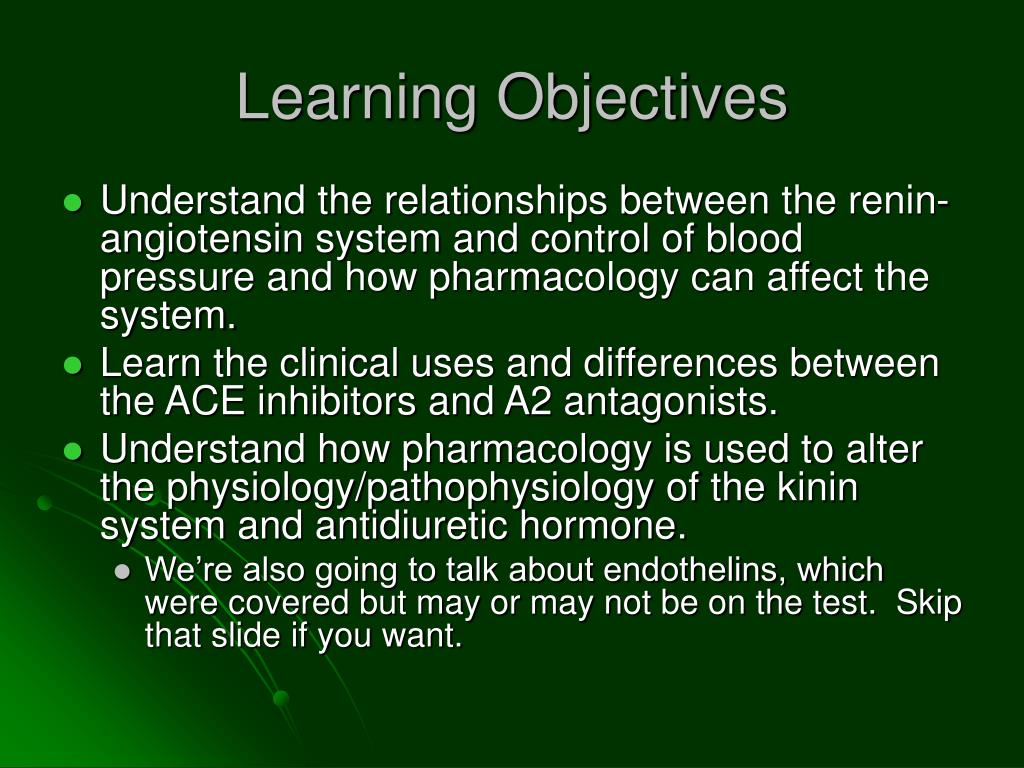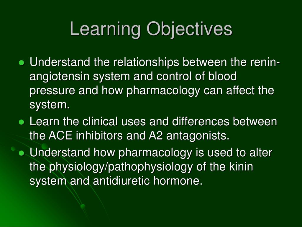 Learning Objectives • Understand the relationships between the renin-angiotensin system and control of blood pressure and how pharmacology can affect the system. • Learn the clinical uses and differences between the ACE inhibitors and A2 antagonists. • Understand how pharmacology is used to alter the physiology/pathophysiology of the kinin system and antidiuretic hormone.