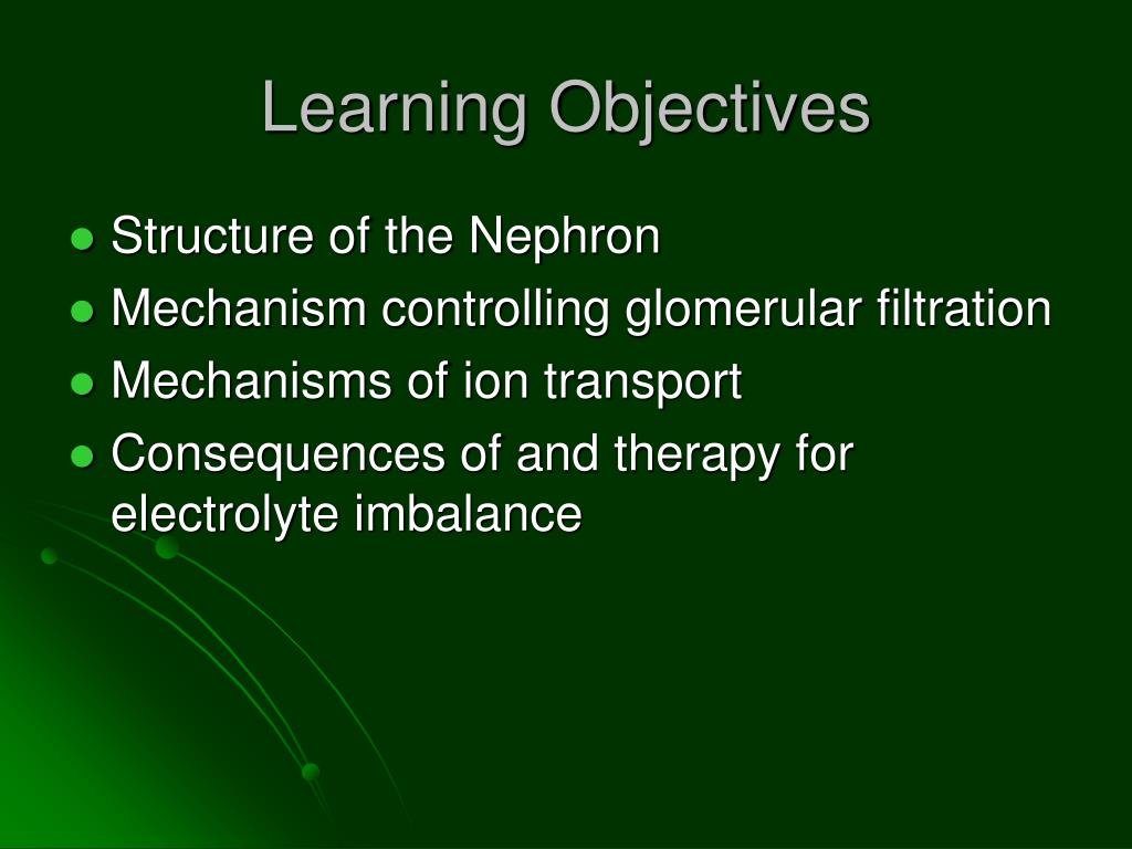 Learning Objectives • Structure of the Nephron • Mechanism controlling glomerular filtration • Mechanisms of ion transport • Consequences of and therapy for electrolyte imbalance