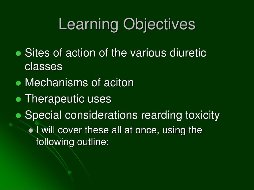 Learning Objectives • Sites of action of the various diuretic classes • Mechanisms of aciton • Therapeutic uses • Special considerations rearding toxicity • I will cover these all at once, using the following outline: