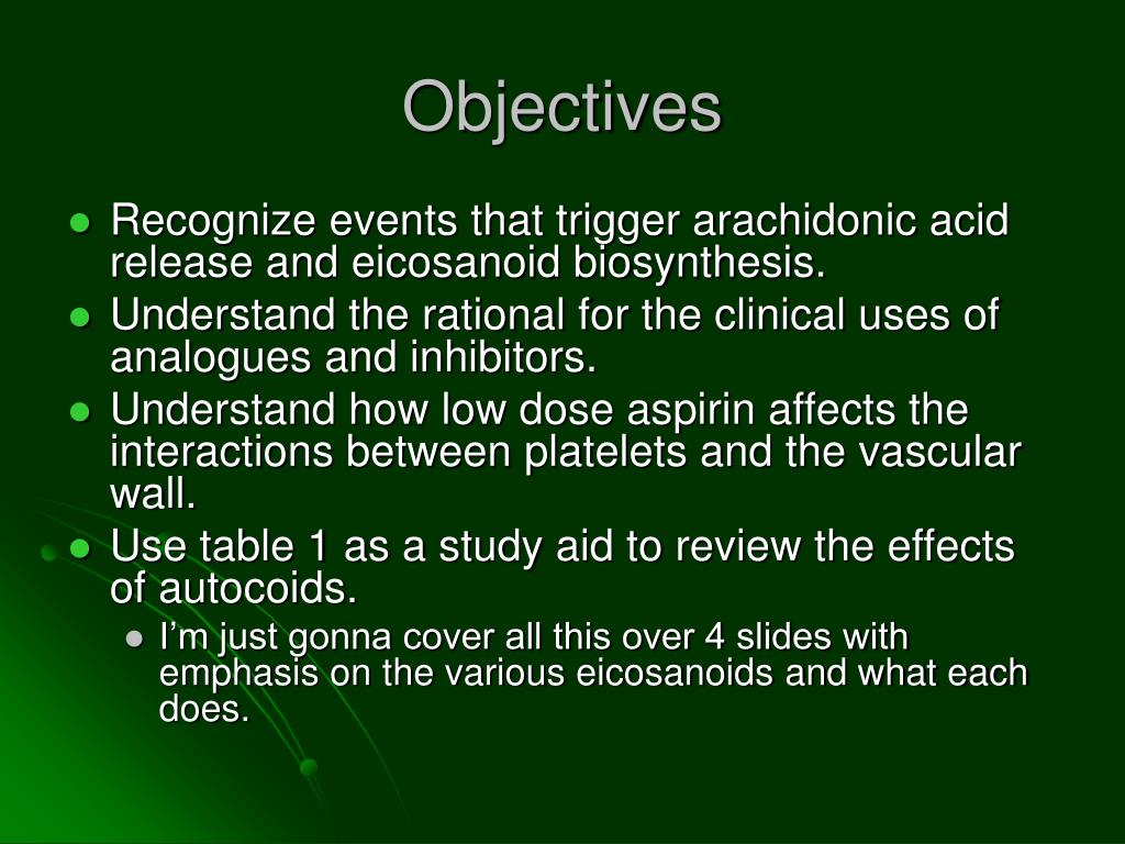 Objectives • Recognize events that trigger arachidonic acid release and eicosanoid biosynthesis. • Understand the rational for the clinical uses of analogues and inhibitors. • Understand how low dose aspirin affects the interactions between platelets and the vascular wall. • Use table 1 as a study aid to review the effects of autocoids. • I’m just gonna cover all this over 4 slides with emphasis on the various eicosanoids and what each does.