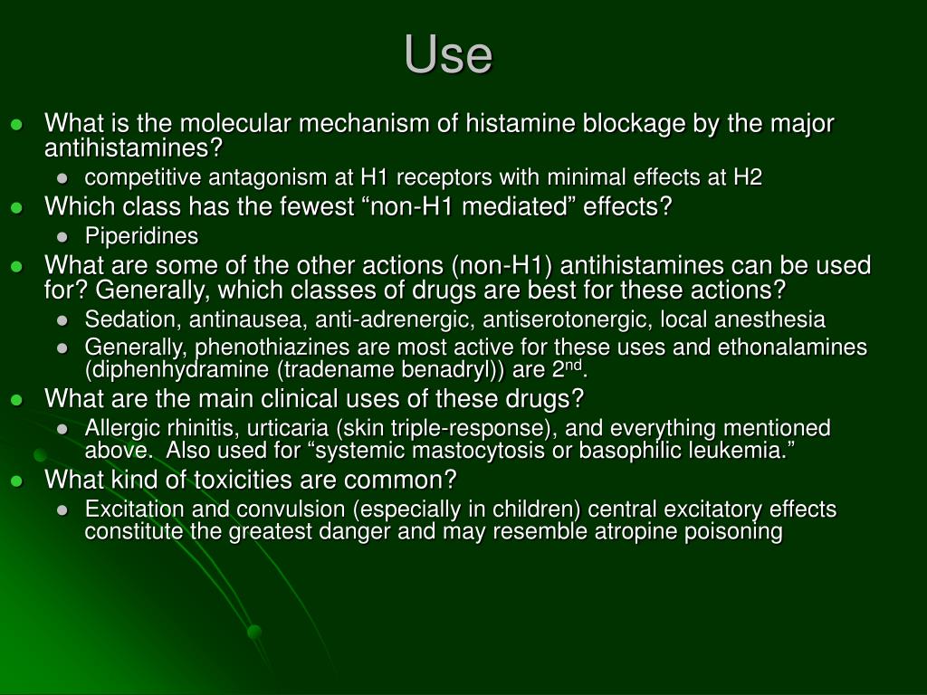 Use • What is the molecular mechanism of histamine blockage by the major antihistamines? • competitive antagonism at H1 receptors with minimal effects at H2 • Which class has the fewest “non-H1 mediated” effects? • Piperidines • What are some of the other actions (non-H1) antihistamines can be used for? Generally, which classes of drugs are best for these actions? • Sedation, antinausea, anti-adrenergic, antiserotonergic, local anesthesia • Generally, phenothiazines are most active for these uses and ethonalamines (diphenhydramine (tradename benadryl)) are 2nd. • What are the main clinical uses of these drugs? • Allergic rhinitis, urticaria (skin triple-response), and everything mentioned above. Also used for “systemic mastocytosis or basophilic leukemia.” • What kind of toxicities are common? • Excitation and convulsion (especially in children) central excitatory effects constitute the greatest danger and may resemble atropine poisoning