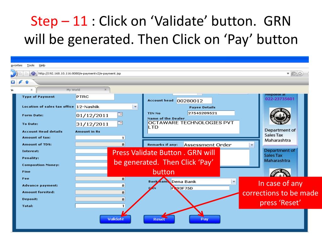 Step – 11 : Click on ‘Validate’ button. GRN will be generated. Then Click on ‘Pay’ button Press Validate Button . GRN will be generated. Then Click ‘Pay’ button In case of any corrections to be made press ‘Reset’