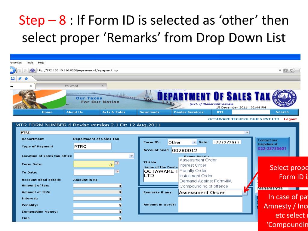 PTRC e-PaymentStep – 1 : Go to web-site of Department of Sales Tax ‘www.mahavat.gov.in’ Click here for PTRC e-payment Click here for PTEC e-payment